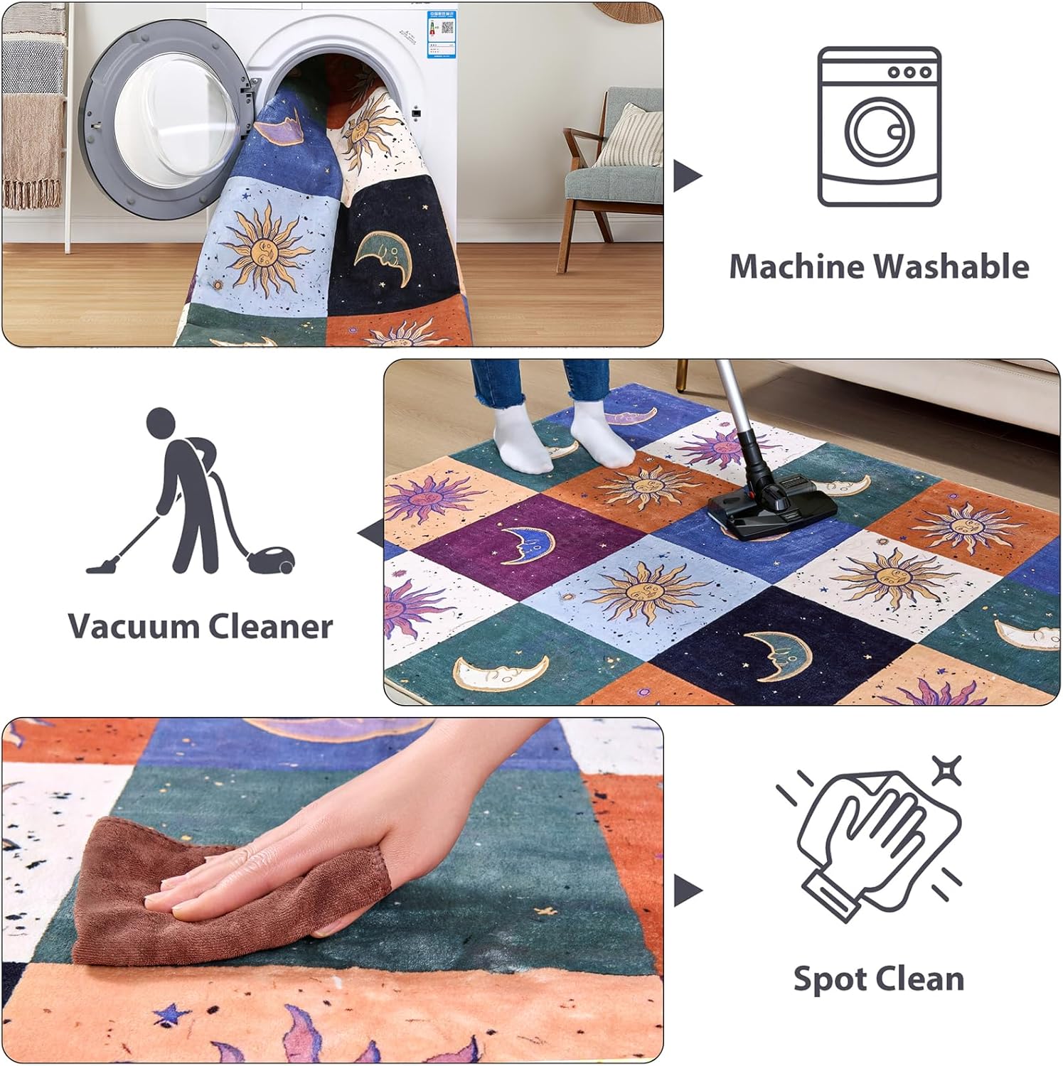 [Lavable a máquina] Se recomienda limpiar las manchas y aspirar regularmente para el mantenimiento diario. La lavadora y la secadora también están disponibles para una limpieza más profunda, lavar en agua fría y secar en secadora a baja temperatura