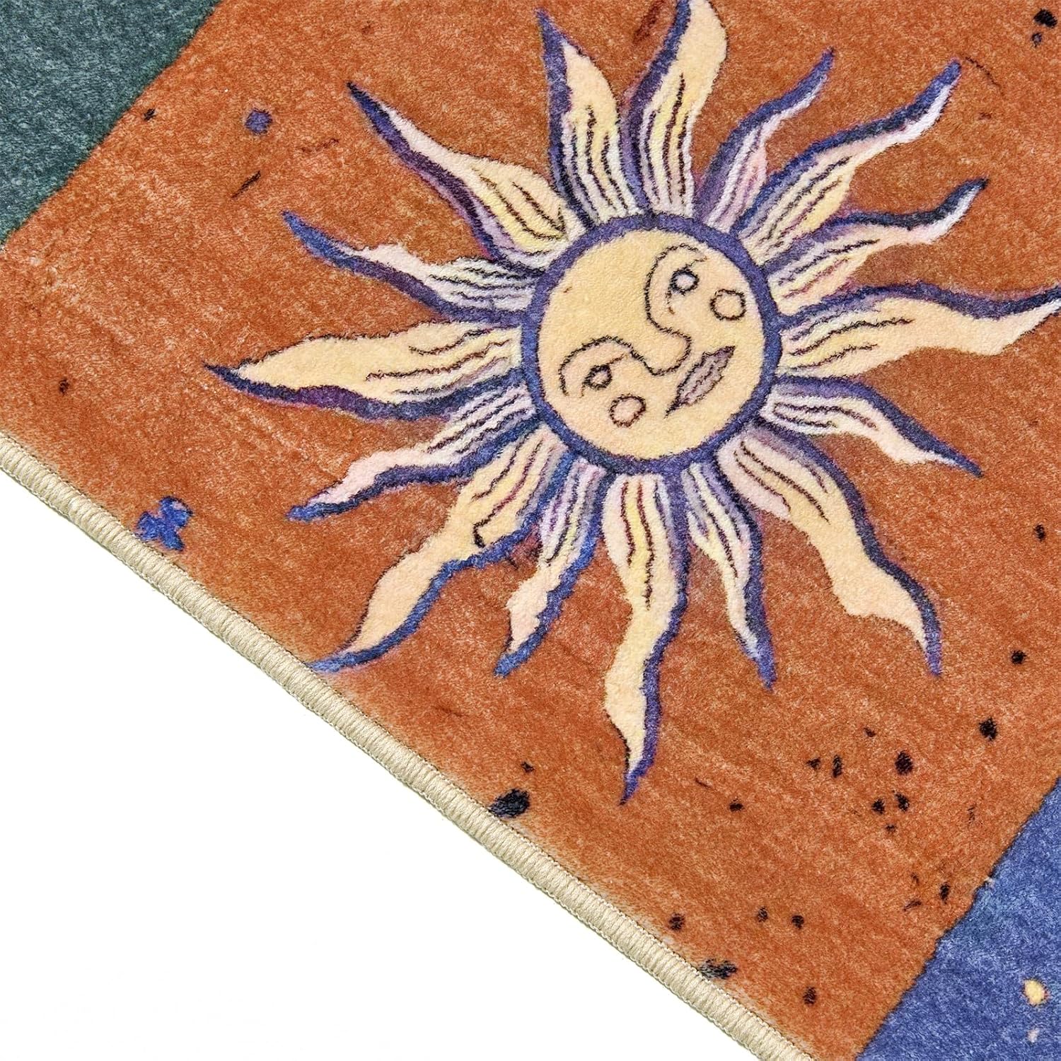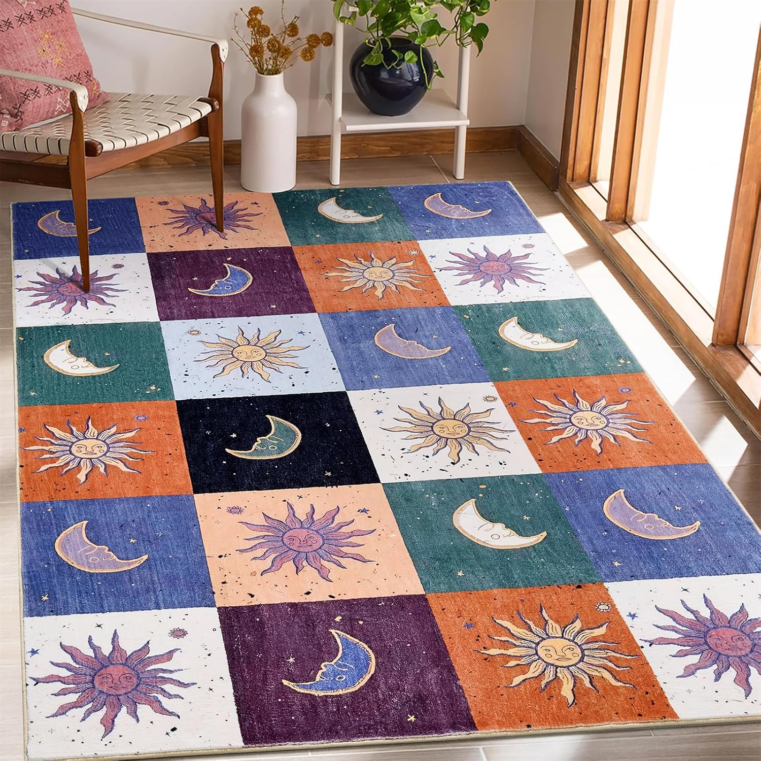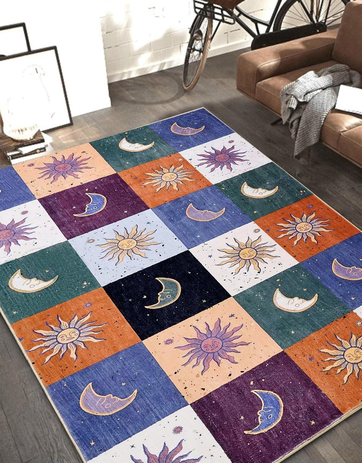 [ADICIONES DE ALFOMBRA DE ÁREA CELESTICA] Esta alfombra de área de astrología añade mística y vida a tu hogar con un patrón retro de sol y luna en diseño de tablero de ajedrez. Esta bonita alfombra mejorará instantáneamente tu baño