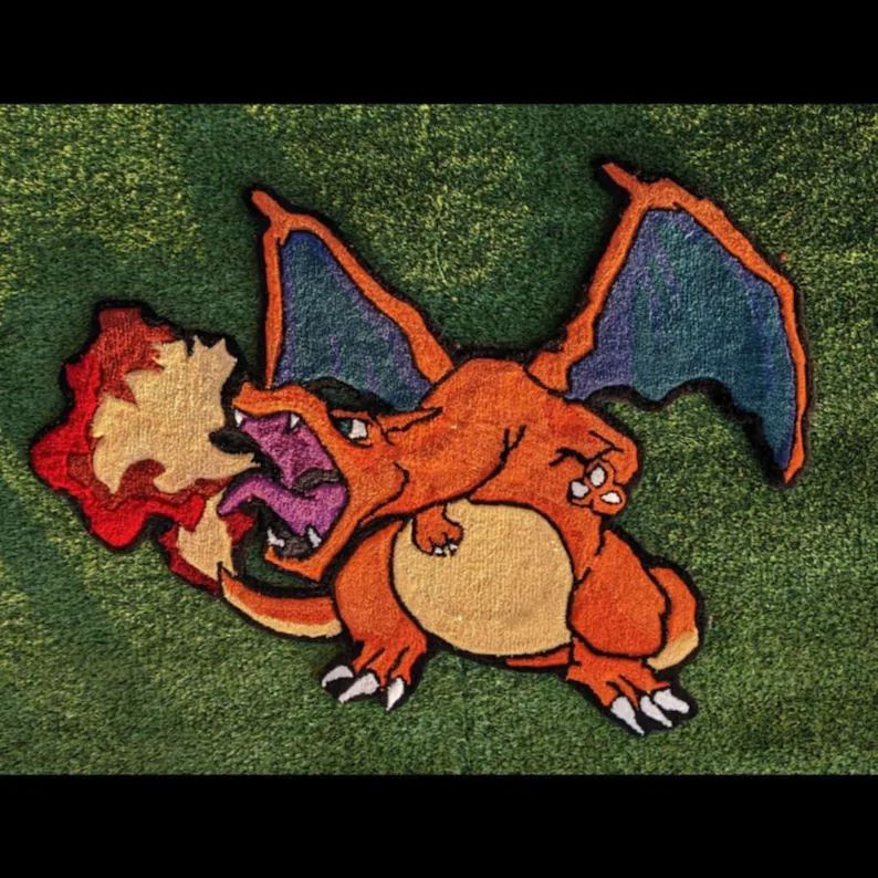 Alfombra artesanal de lana o acrílico que reproduce al Pokémon de primera generación, Charizard. La figura es de color naranja con el vientre crema y alas de tonos morados/azules. Se le ve en una postura de ataque, lanzando una voluminosa ráfaga de fuego amarillo y rojo. El fondo de la imagen es un césped sintético verde oscuro