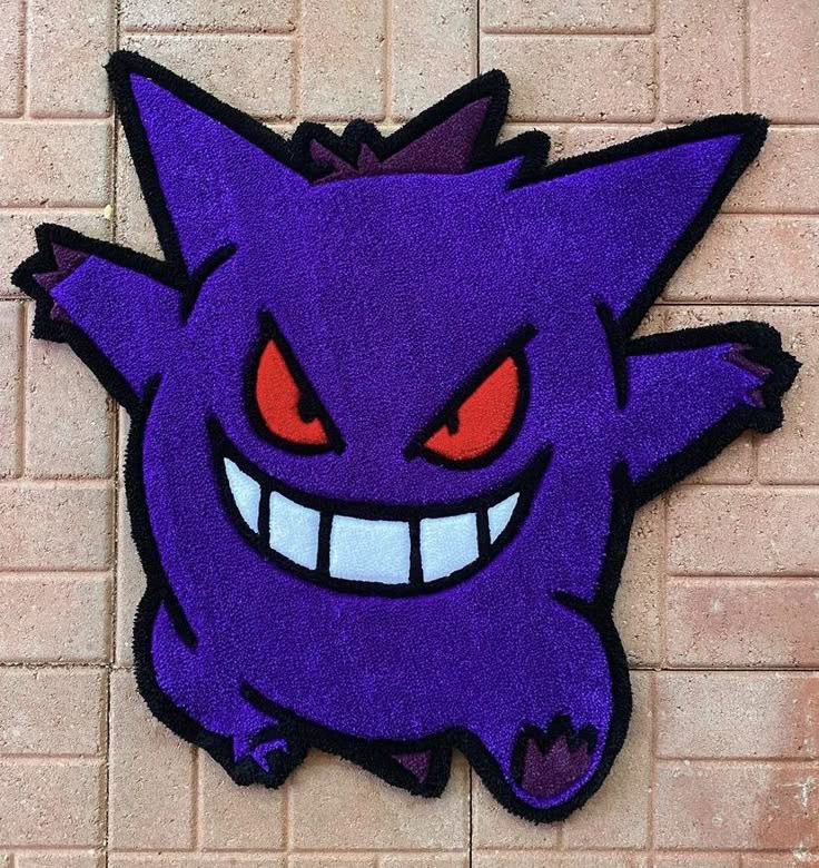 Alfombra de corte y contorno que reproduce al famoso Pokémon de tipo Fantasma, Gengar, en su pose característica. Está elaborada en un color púrpura oscuro e intenso, con un contorno negro grueso. Los detalles faciales, como sus grandes ojos rojos y su sonrisa siniestra con dientes blancos, están delineados con precisión, dándole un aspecto intimidante pero divertido. Es una pieza esencial de decoración para cualquier fanático de Pokémon que busque un toque gamer en su espacio