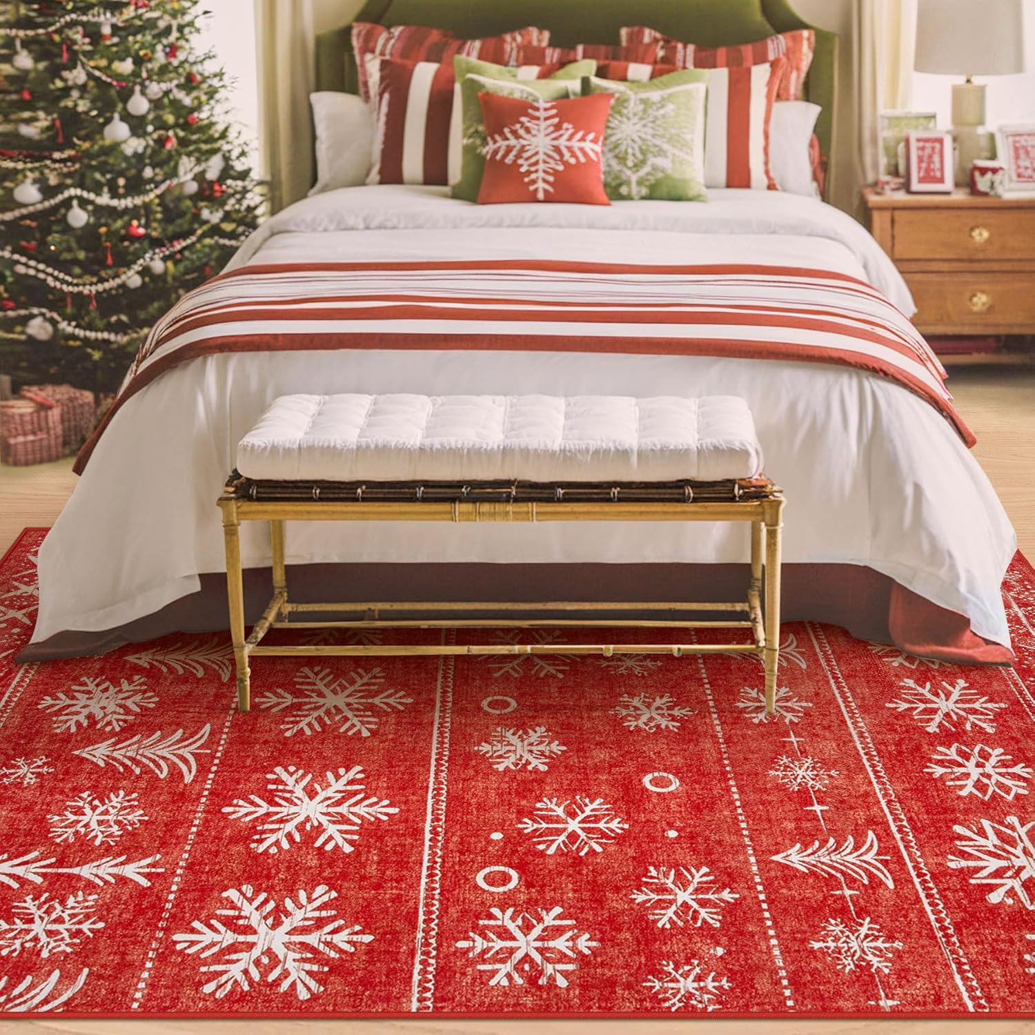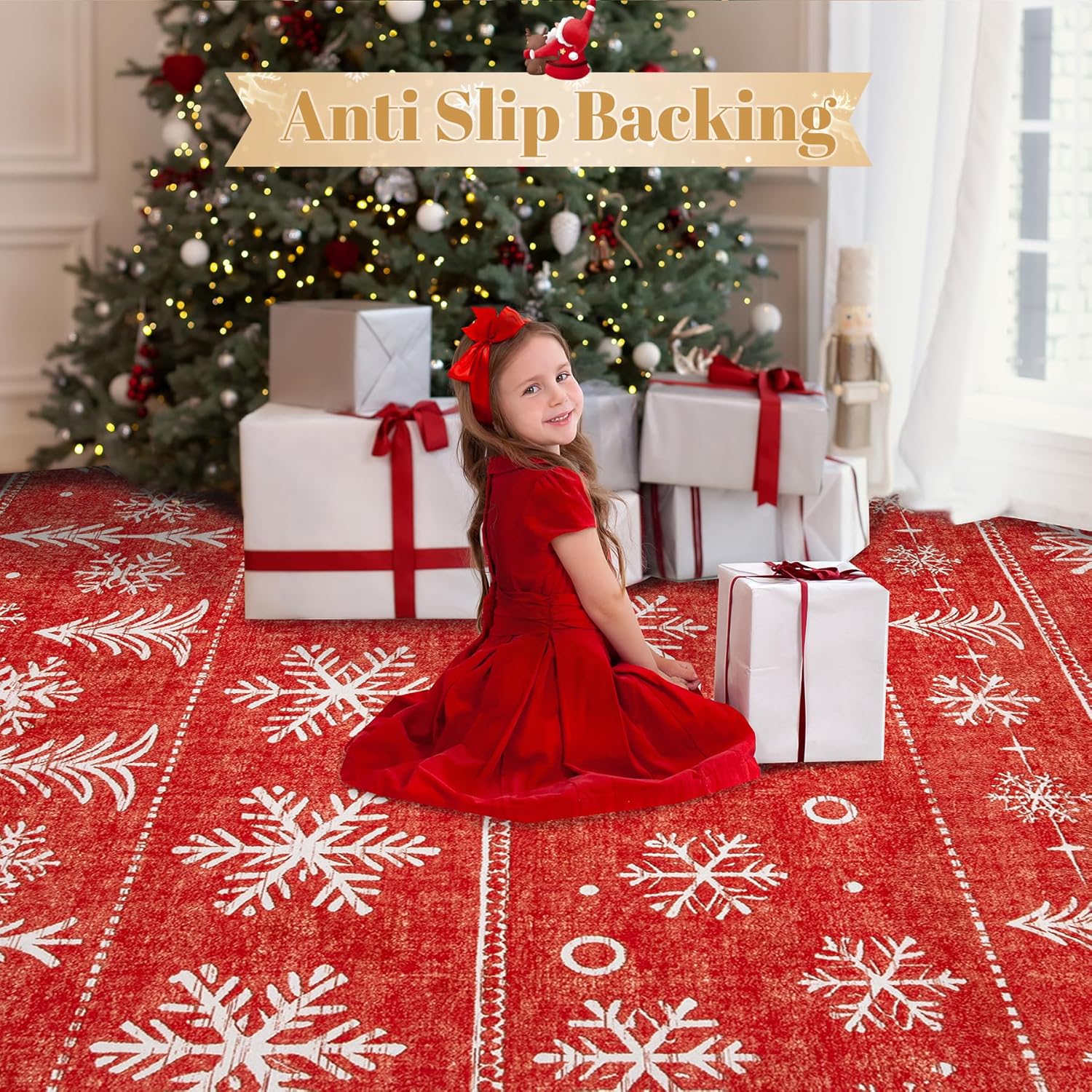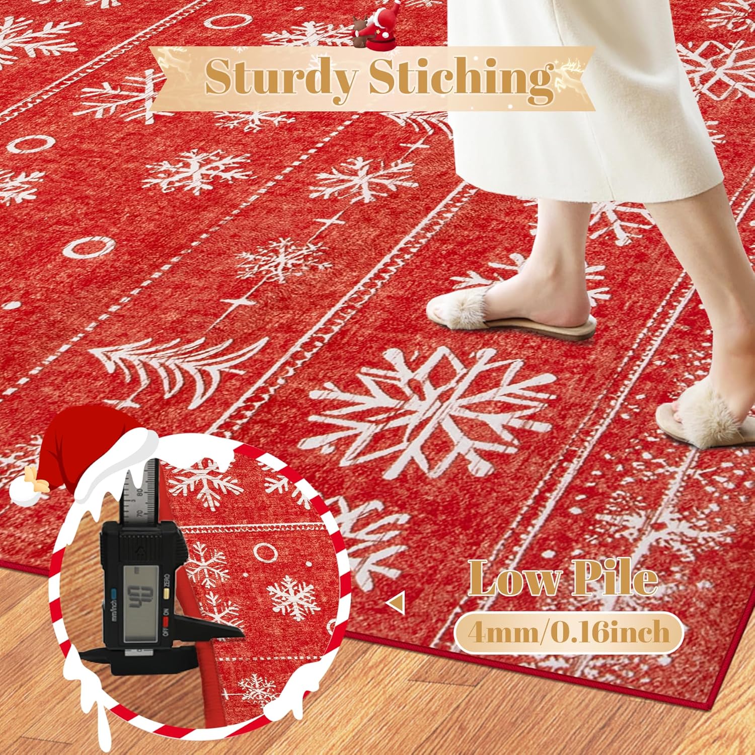 Alfombra de área navideña y a la moda: especialmente diseñada en un clásico color rojo de Navidad con patrón de copo de nieve y árbol de Navidad, para proporcionarte un sabor de cálida decoración del hogar, esta alfombra de Navidad es adecuada para sala de estar, dormitorio, cocina, comedor, estudio, habitación de los niños, baño y otros lugares que necesites.