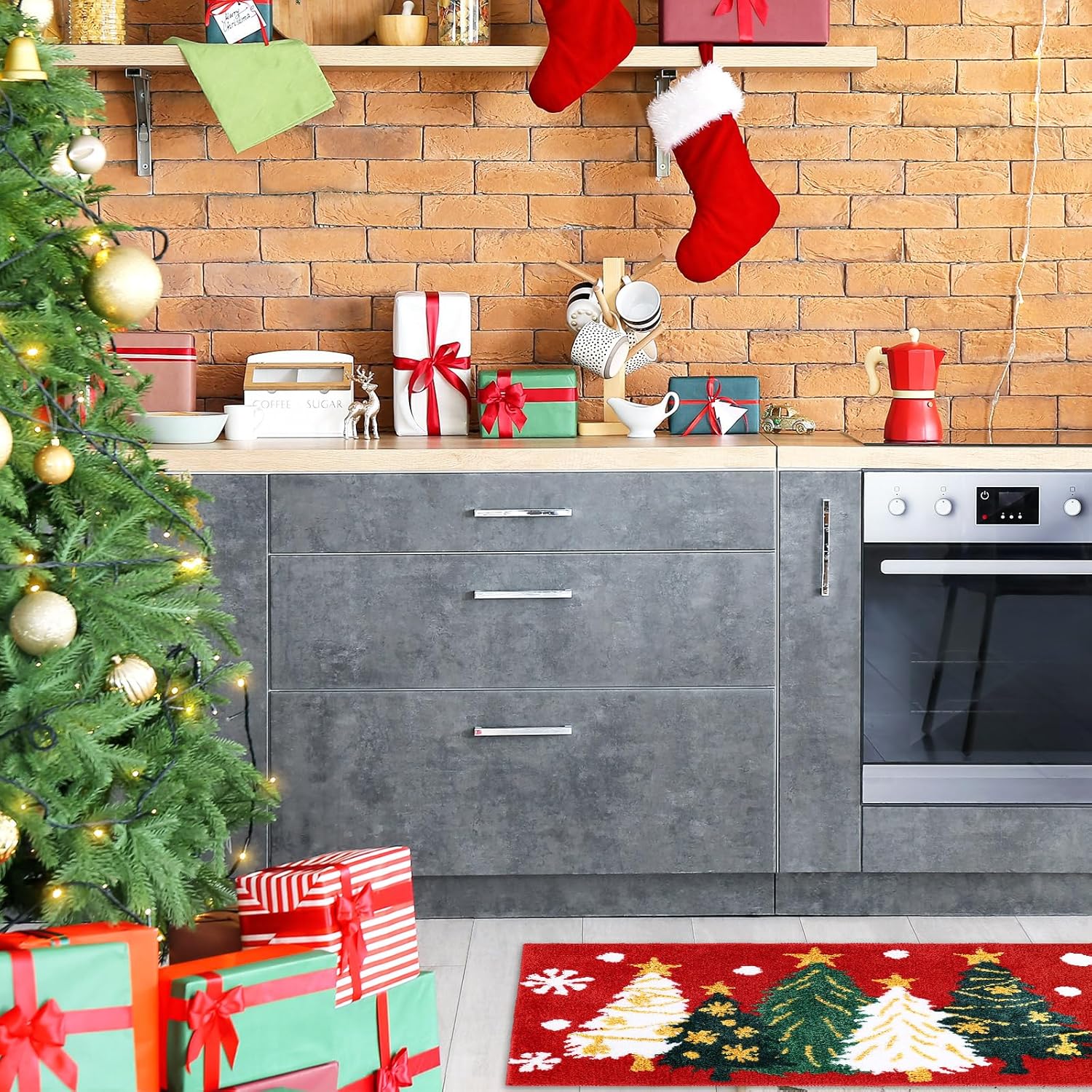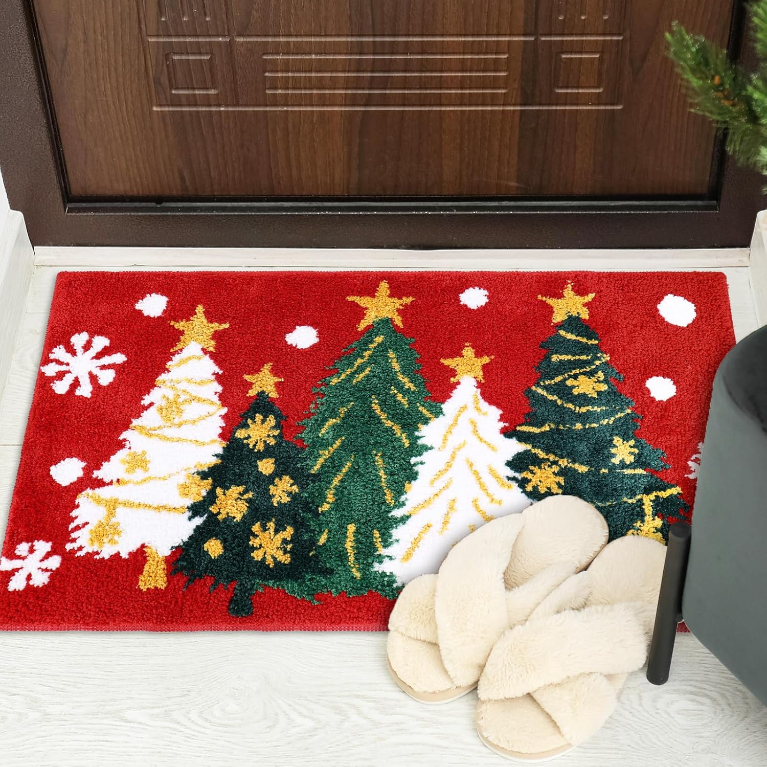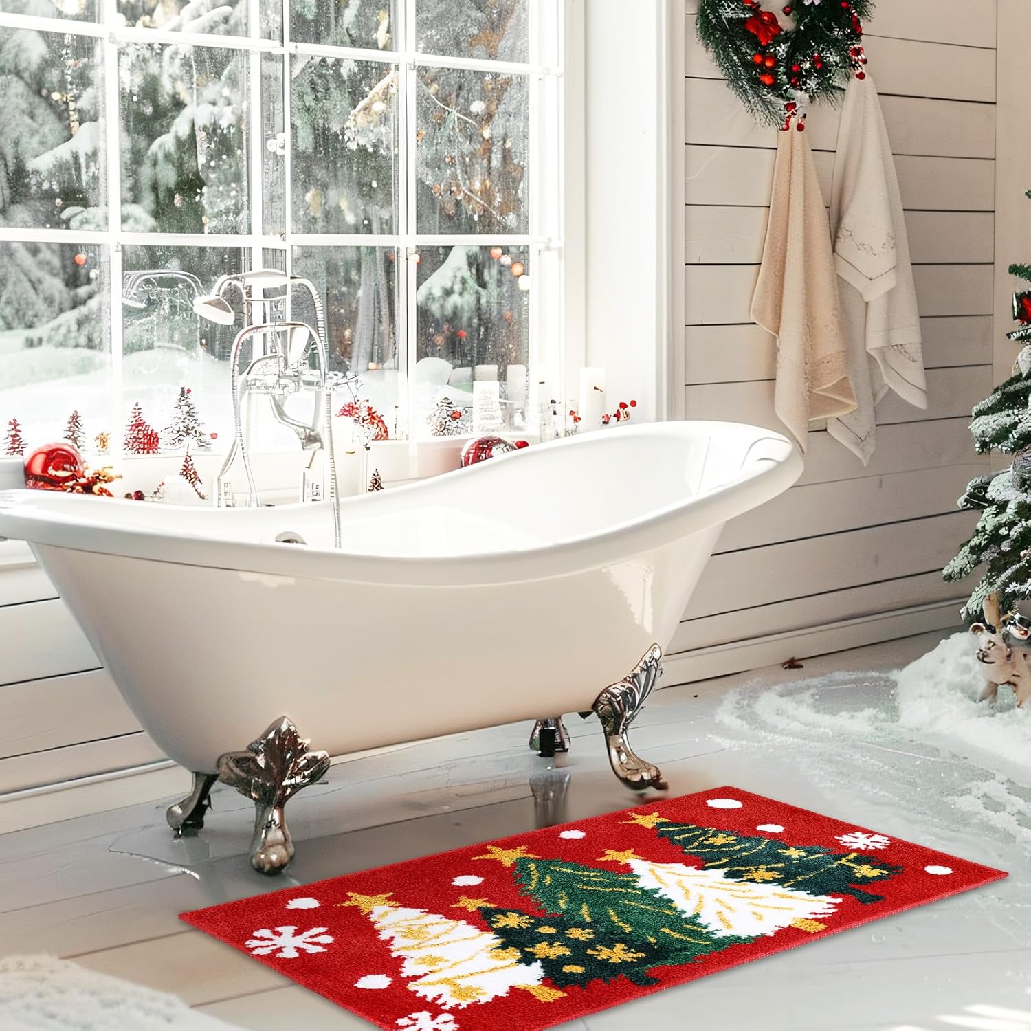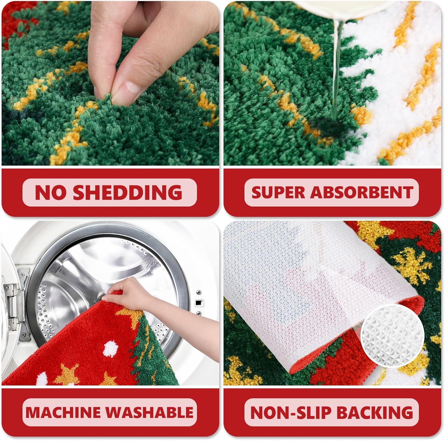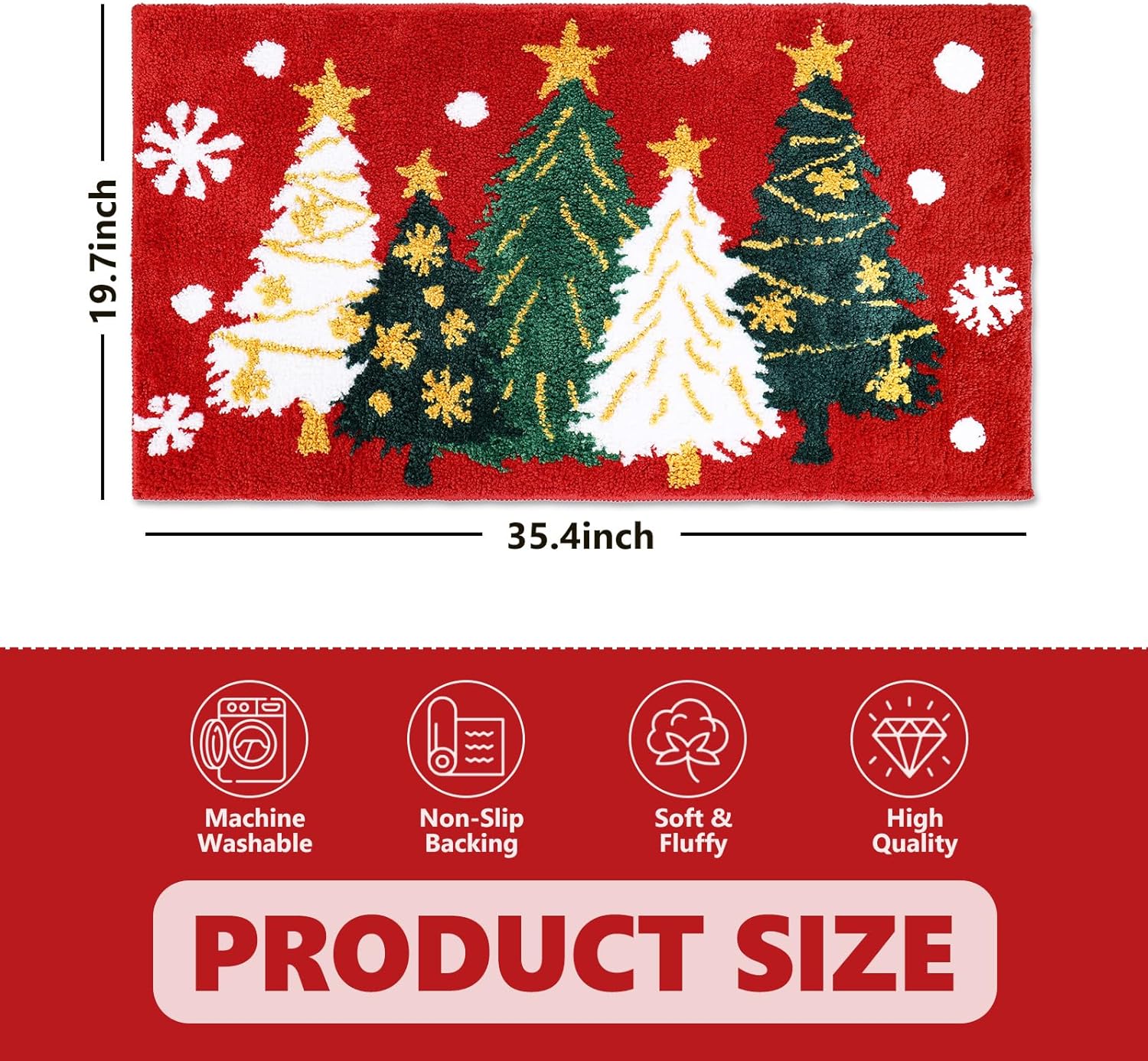 Diseño delicado: nuestra alfombra de baño copetuda adopta el tema de Navidad, con patrón de copo de nieve y árbol de Navidad sobre el fondo rojo, exquisito y llamativo, lo que creará un ambiente festivo para tu hogar o fiesta