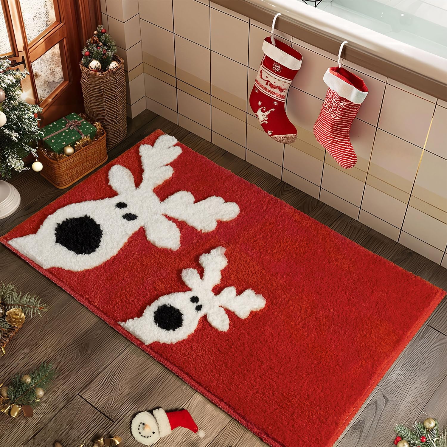 Alfombra de baño de Navidad, diseño de reno, decoración de baño, color rojo, bonita, antideslizante, suave, absorbente y lavable