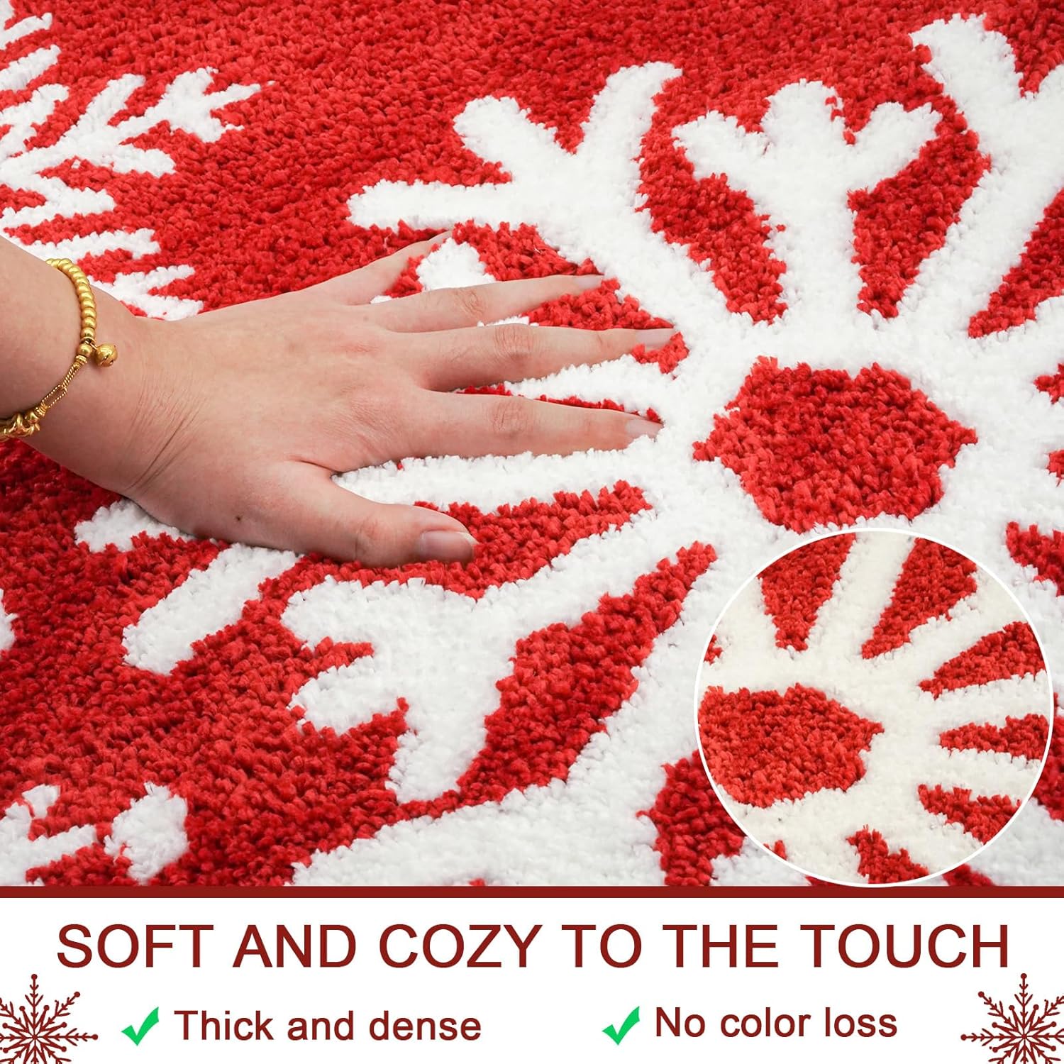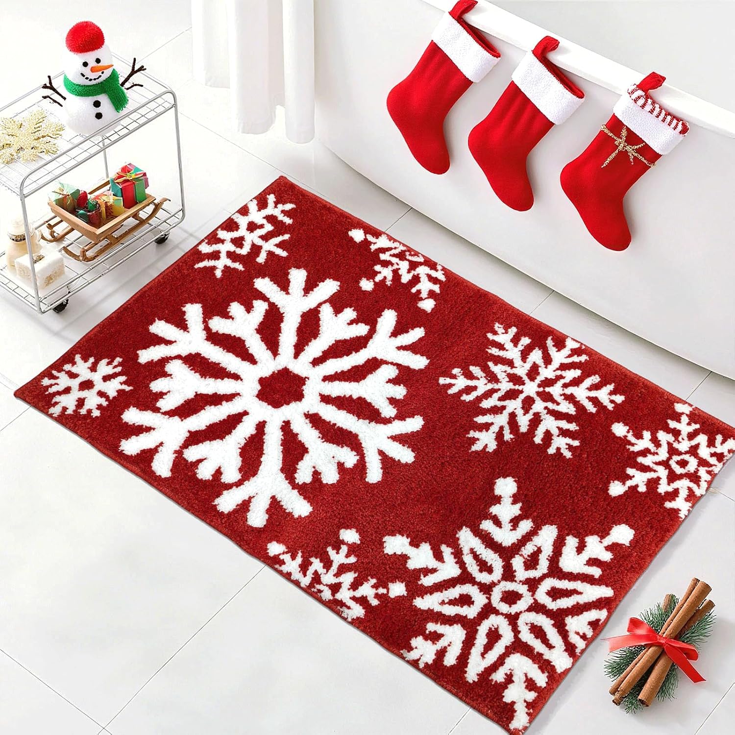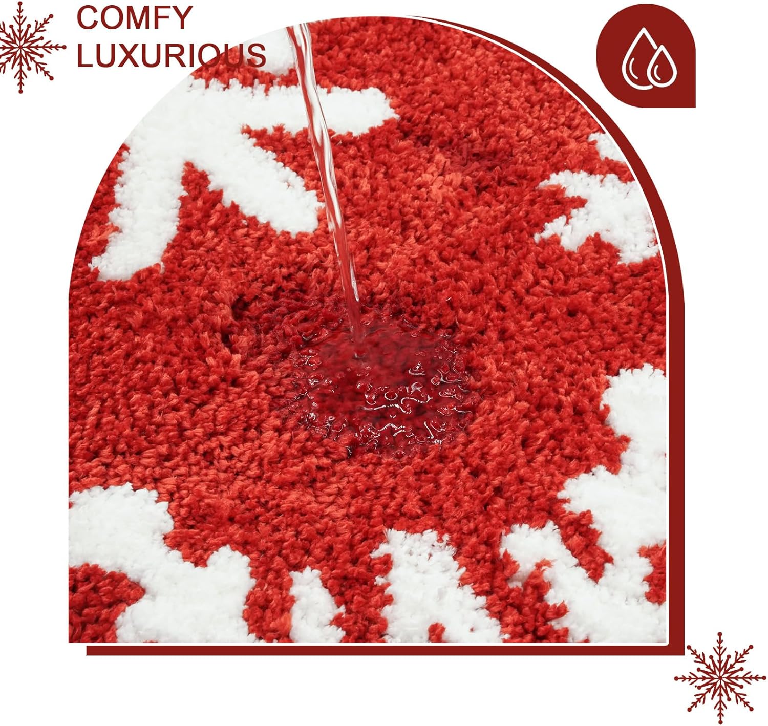 Absorbente y antideslizante: la alfombra de baño de Navidad de copo de nieve rojo puede absorber el agua rápidamente; el respaldo antideslizante está hecho de TPR que garantiza la estabilidad y evita el desplazamiento y el deslizamiento, incluso en condiciones húmedas.