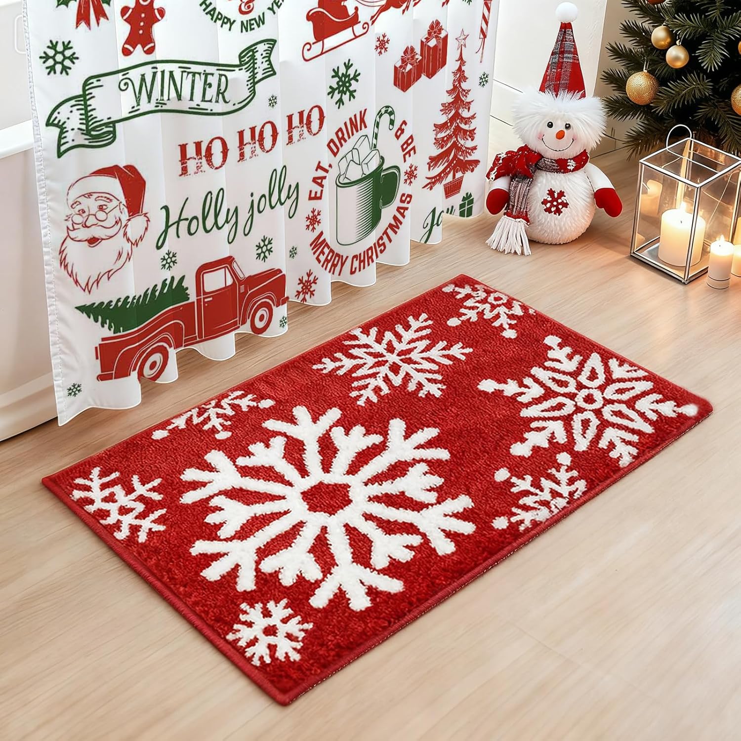 Multiusos: esta alfombra de Navidad tiene diseños lindos y encantadores, son perfectos para todo tipo de decoración del hogar, y se puede aplicar en el baño, tocador, fregadero, ducha, decoración de ducha de bañera, sala de estar, habitación de invitados, habitación de los niños, puerta y cocina.