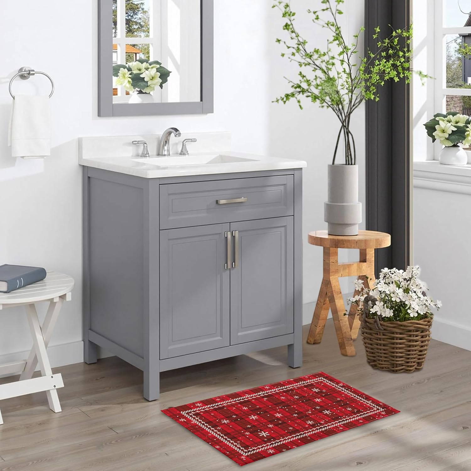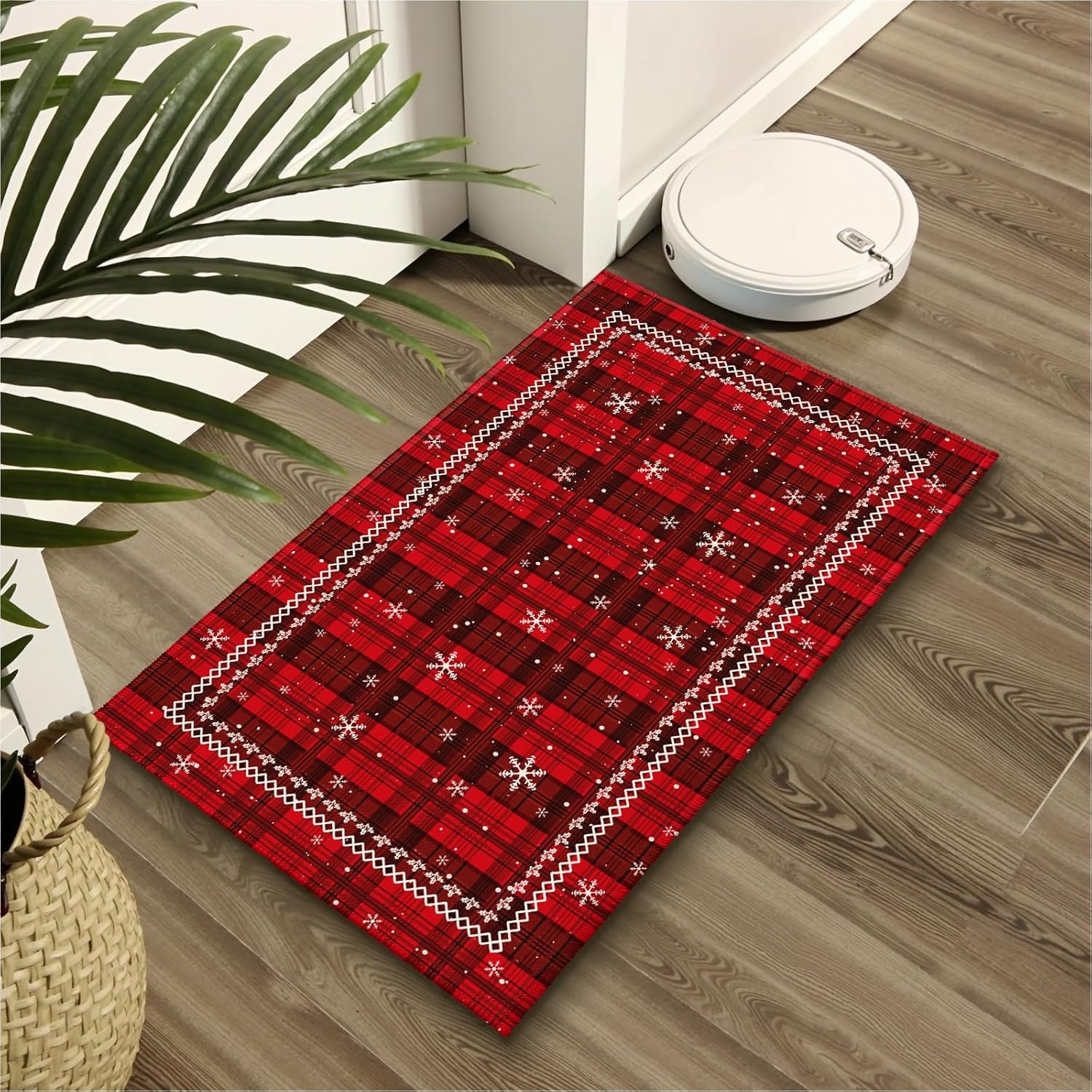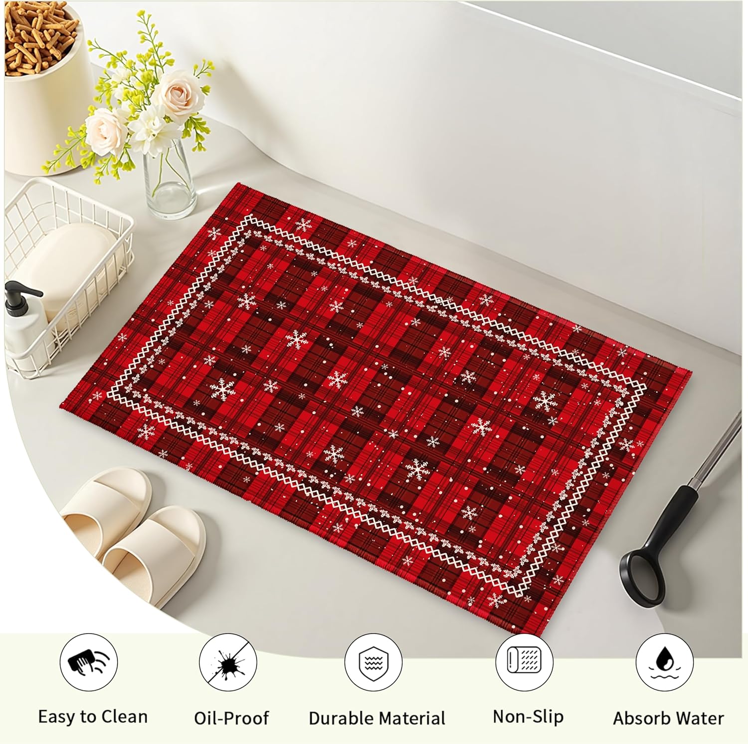 Amplio uso: esta alfombra de cuadros rojos de Navidad es novedosa y los diseños artísticos son perfectos para todo tipo de decoración del hogar, y se puede aplicar en el baño, tocador, fregadero, ducha, decoración de ducha de bañera, sala de estar, habitación de invitados, terraza, patio, porche, balcón, entrada, puerta y cocina