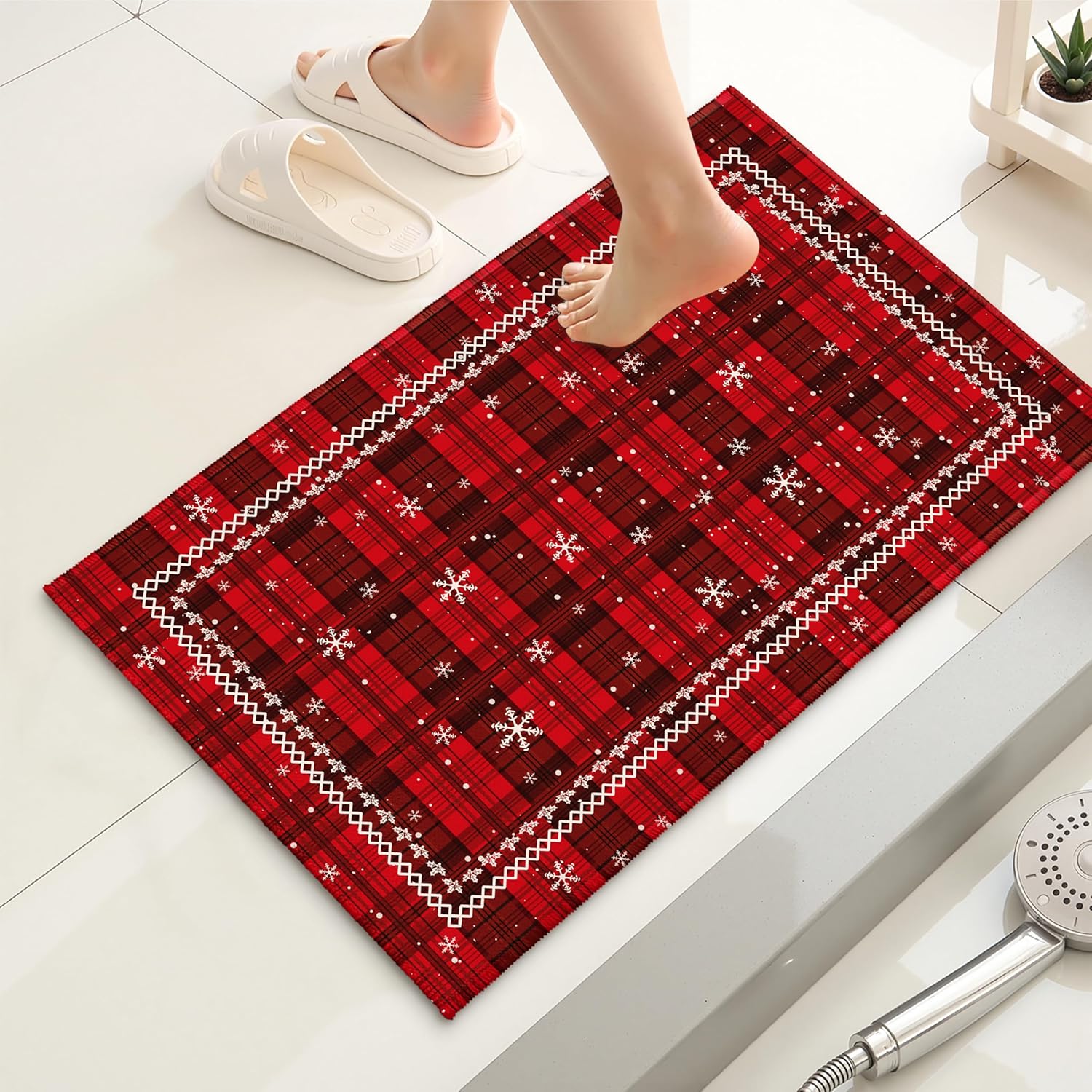 Alfombra de baño roja de Navidad a cuadros, tapete de baño de copos de nieve de invierno, alfombra de ducha extra suave, alfombra de felpa de 20 x 32 pulgadas, antideslizante, absorbente, tapete de