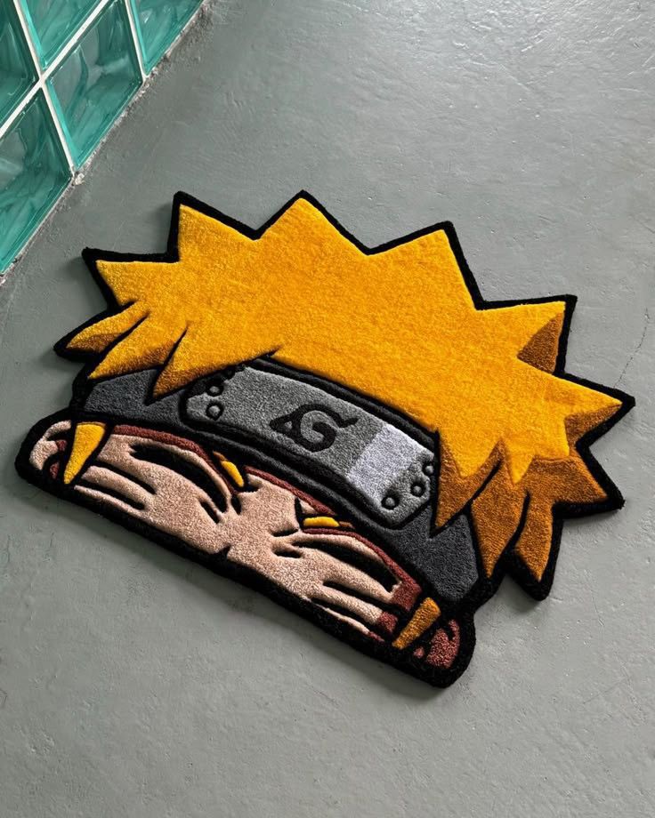Esta es una alfombra decorativa de pelo que reproduce la parte superior de la cabeza del personaje de anime Naruto Uzumaki, de la serie Naruto. La alfombra tiene un contorno irregular que imita la forma del cabello rubio en punta del personaje, que está realizado en un amarillo/naranja brillante. Debajo del cabello se encuentra la banda ninja (Hitai-ate) de Konoha (Aldea Oculta de la Hoja), representada por una tela negra y la placa metálica de color gris con el símbolo de la espiral. Debajo de la banda, se aprecian los ojos cerrados de Naruto, las cejas y parte de la piel, con un contorno grueso negro. La alfombra está colocada sobre un suelo de cemento pulido o baldosa gris, con un borde de baldosas de cristal azul verdoso a la izquierda
