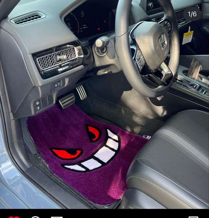 Una alfombra de coche de color morado con la cara del Pokémon tipo fantasma Gengar. El diseño muestra la icónica sonrisa de oreja a oreja con dientes blancos y ojos rojos y blancos que brillan en contraste con el morado. La alfombra está perfectamente ajustada al área del asiento del conductor de un coche moderno (posiblemente un Honda), con interior en tonos grises y pedales metálicos