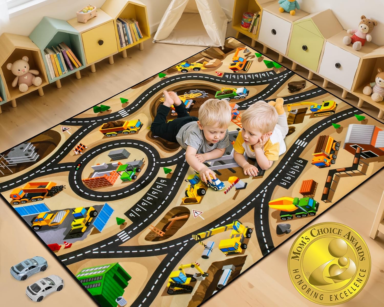 Alfombra de construcción para niños, alfombra de actividades de 5 x 7 pies, lana copetuda y goma, antideslizante, resistente a las manchas y a la decoloración, lavable a máquina, patrón