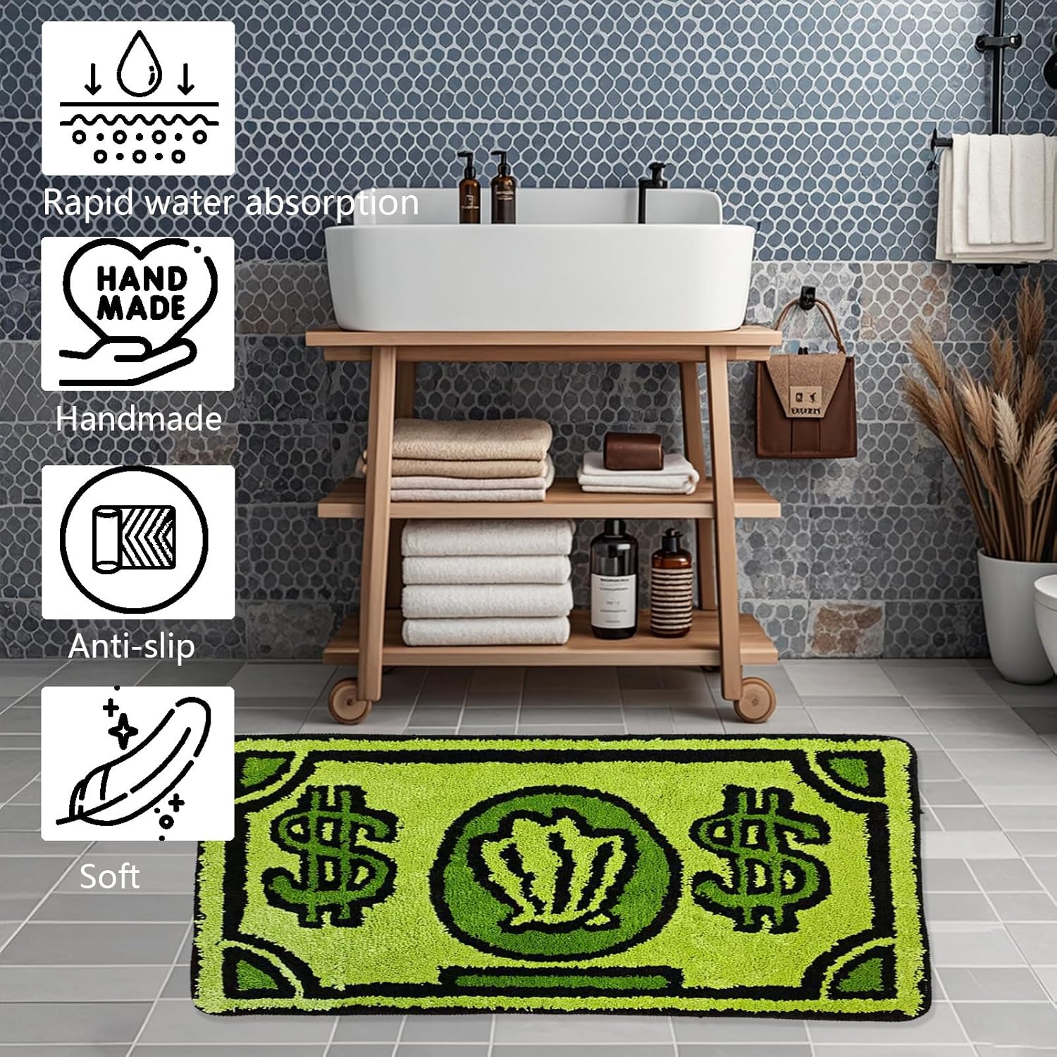 【Alfombras versátiles y geniales para cualquier habitación】Úsalo como tapete de baño, camino de cocina o tapete de entrada. Su diseño con temática de dinero añade un ambiente moderno a dormitorios, salas de estar o incluso cuevas de hombre.