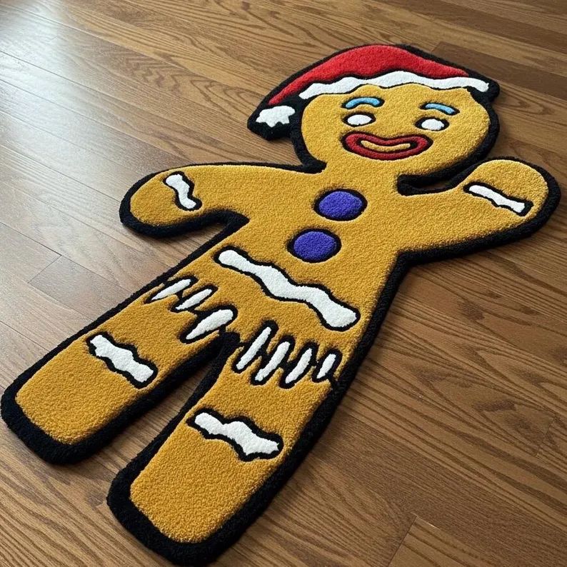 Esta es una alfombra de pelo con forma contorneada que imita la figura de una galleta de jengibre (Gingerbread Man) con temática navideña. El cuerpo de la galleta es de un color marrón anaranjado afelpado. Está decorada con un gorro de Santa Claus rojo y blanco en la cabeza. El rostro tiene ojos azules y una boca sonriente roja. El cuerpo está decorado con glaseado blanco en forma de zigzag y puntos morados grandes que simulan botones. La alfombra está colocada sobre un suelo de madera laminada
