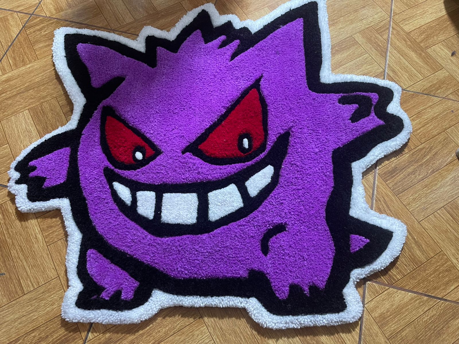 Esta es una alfombra de pelo con forma contorneada que reproduce la imagen del Pokémon Gengar, de la franquicia Pokémon. La alfombra es predominantemente de un color púrpura intenso y afelpado. Gengar tiene una expresión amenazante, con ojos de un rojo vibrante y pupilas blancas, una gran sonrisa malvada con dientes blancos y un contorno grueso de color negro. La forma sigue la silueta del personaje, incluyendo sus orejas puntiagudas, brazos cortos y piernas. Un borde de pelo blanco define el contorno final de la alfombra. Se presenta sobre un suelo de baldosas cerámicas de color marrón y beige
