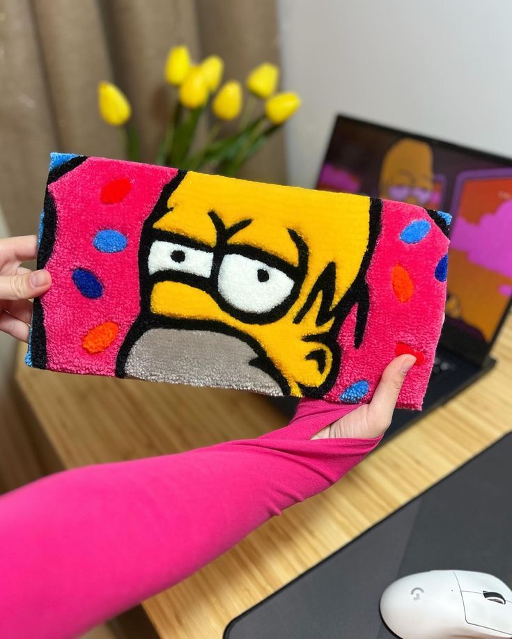 Esta es una alfombra rectangular de pelo largo y grueso, probablemente diseñada como mousepad o pieza decorativa pequeña. Presenta un acercamiento al rostro de Homero Simpson de Los Simpson. Homero tiene una expresión de enojo, confusión o frustración, con los ojos muy abiertos y las cejas fruncidas. El fondo de la alfombra es de un rosa chicle vibrante, salpicado con puntos grandes de colores (rojo, azul, naranja). La alfombra está siendo sostenida por una persona vestida con una manga de color fucsia, sobre un escritorio, cerca de un ramo de tulipanes amarillos