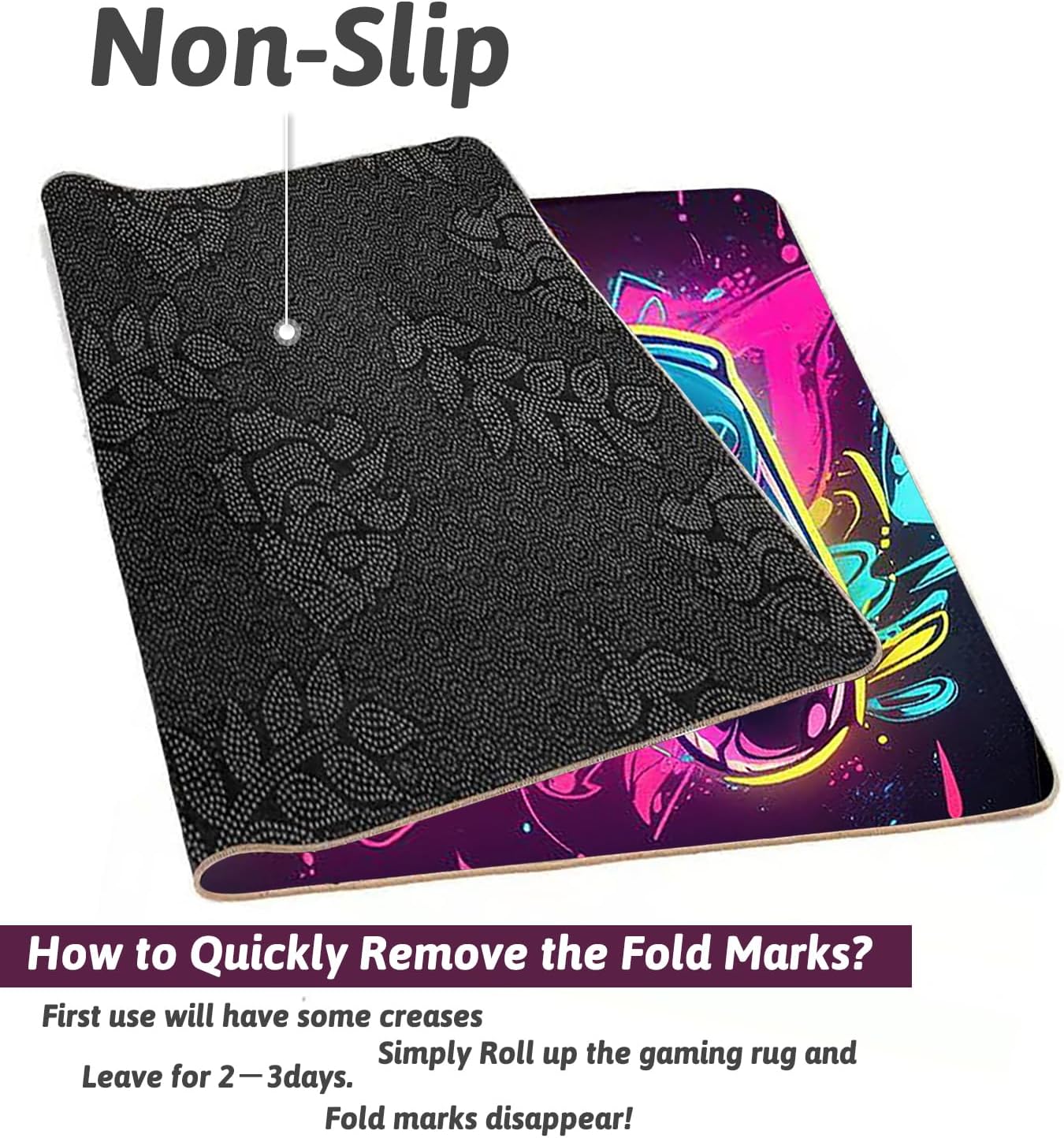 Aviso: la alfombra de juego está empaquetada de manera plegada. Por lo tanto, la alfombra puede tener algunos pliegues y marcas cuando se despliega. Sugerimos enrollarlo o colocarlo plano en el suelo durante unos días, y las arrugas desaparecerán naturalmente. También puede aplanarlo rápidamente con una plancha.