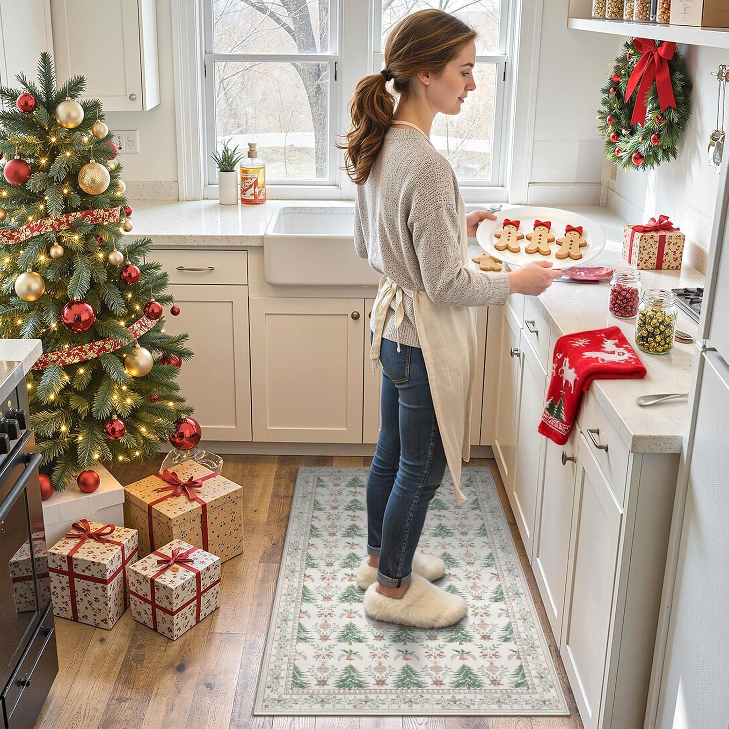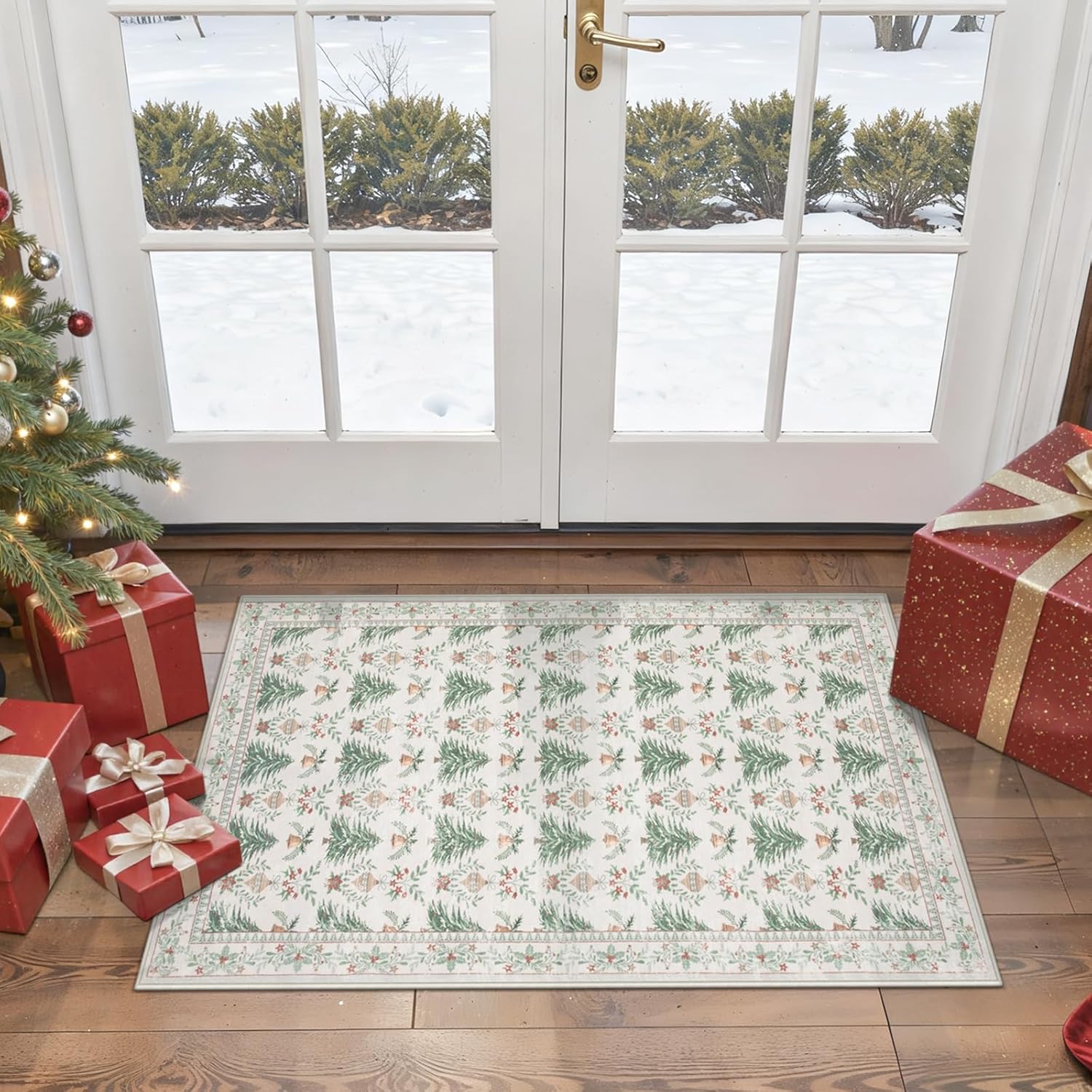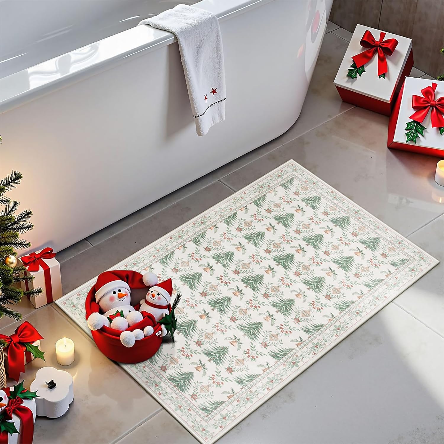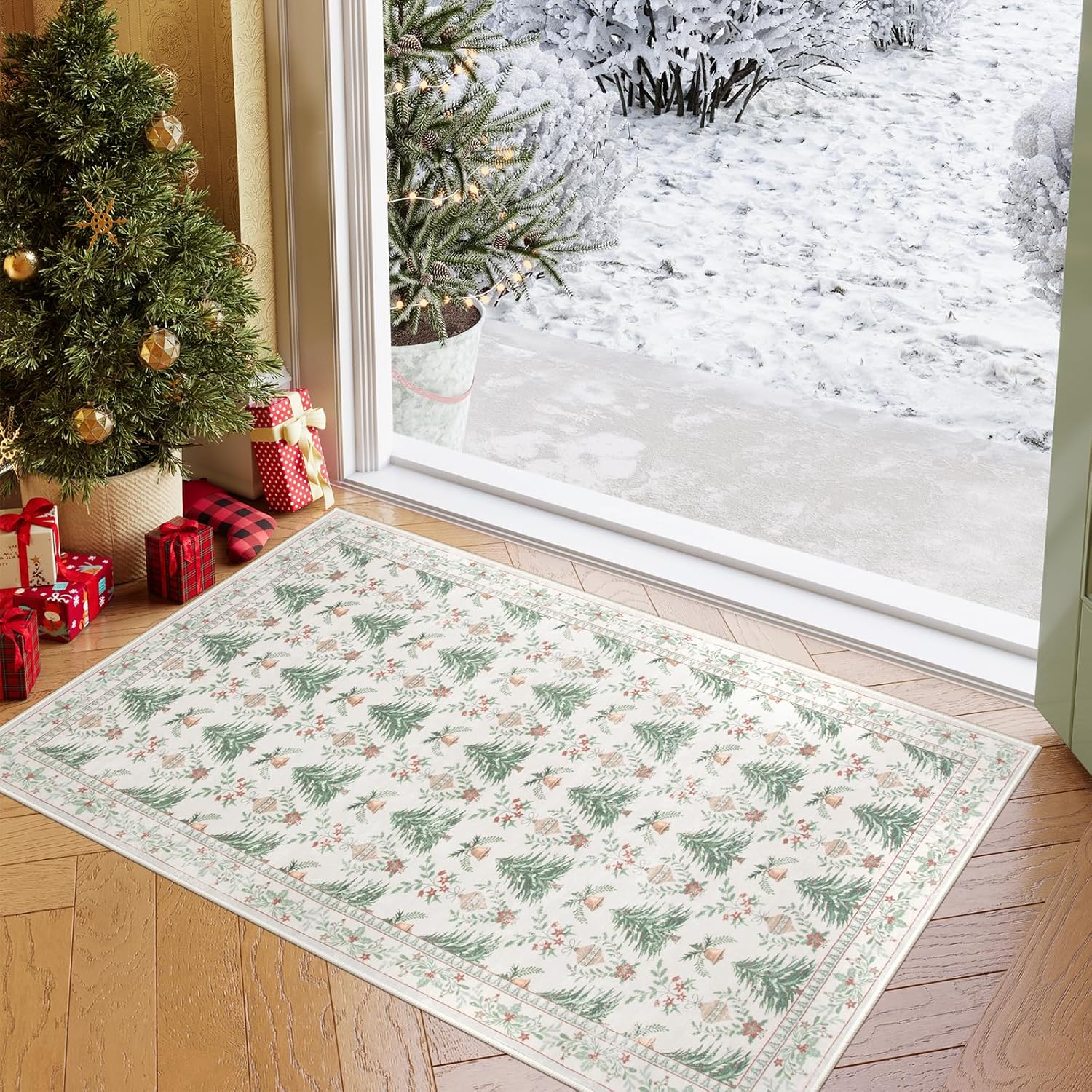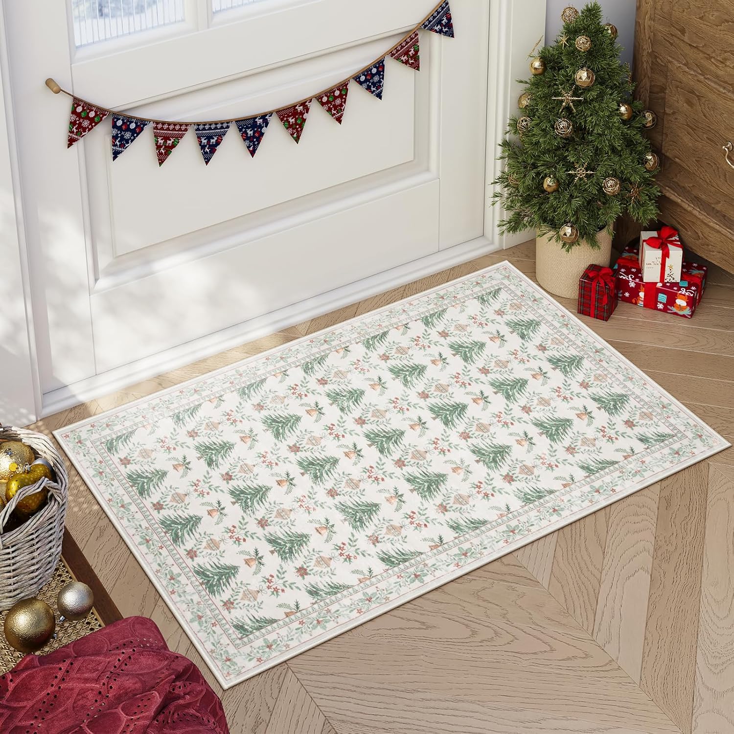 [Ultra suave y cómoda]: hecha de fibras de lana artificiales, la alfombra Yuemasi ofrece una textura de lujo que se siente acogedora y suave bajo los pies, adecuada para las vacaciones y más allá en los acogedores meses de invierno. El patrón es tan festivo con árboles, campanillas pequeñas y adornos. Y el diseño vibrante añade un toque alegre a tu decoración navideña.