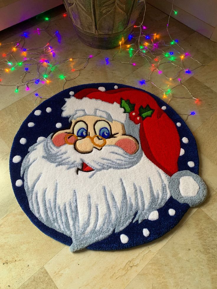 Alfombra de forma circular y de tufting, con un diseño detallado del rostro de Papá Noel (Santa Claus). Presenta su barba blanca, mejillas rosadas y su icónico gorro rojo con detalles de acebo. El fondo es azul oscuro salpicado de puntos blancos que simulan nieve. La imagen muestra la alfombra en un interior iluminado por luces navideñas de colores