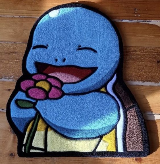 Esta es una alfombra de pelo con forma contorneada que representa al Pokémon Squirtle. El cuerpo de Squirtle es de un color azul cielo afelpado y tiene una expresión de alegría, con los ojos cerrados en una gran sonrisa. Está sosteniendo una flor grande de color rosa y amarillo. Su caparazón es detallado en varios tonos de marrón y amarillo, como si fuera de vidriera. El diseño está delineado con un contorno negro grueso. Se presenta sobre un fondo de tablas de madera
