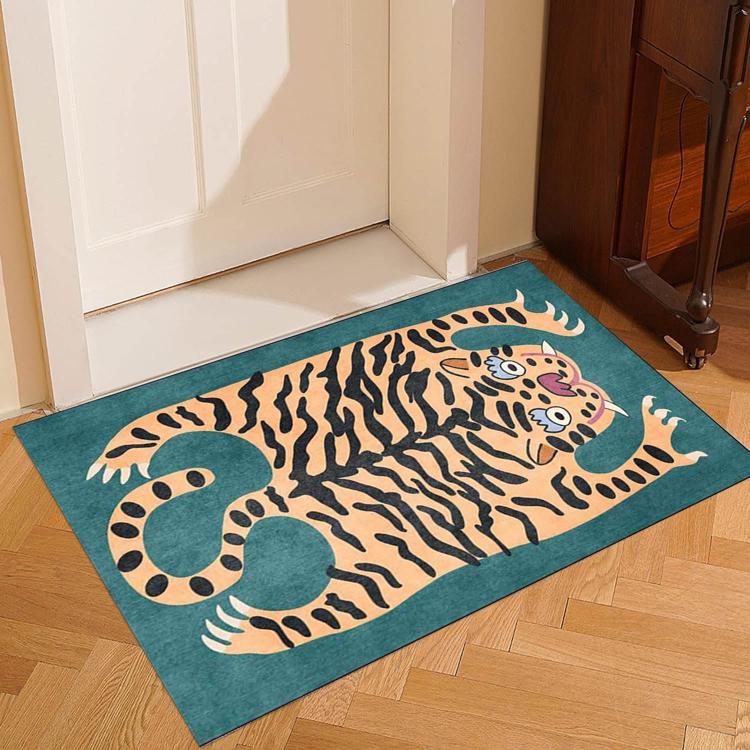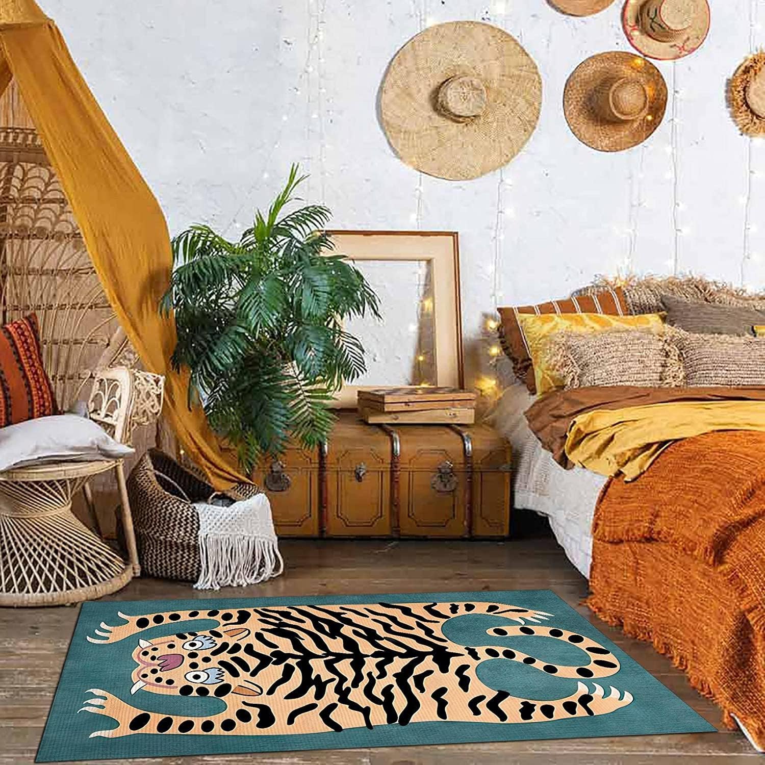 Alfombra de tigre para dormitorio, estilo vintage, bohemio, de 2 x 3 pies, alfombra de área pequeña, lavable, tapete funky para habitación de niños, antideslizante, dibujos animados, tapete para