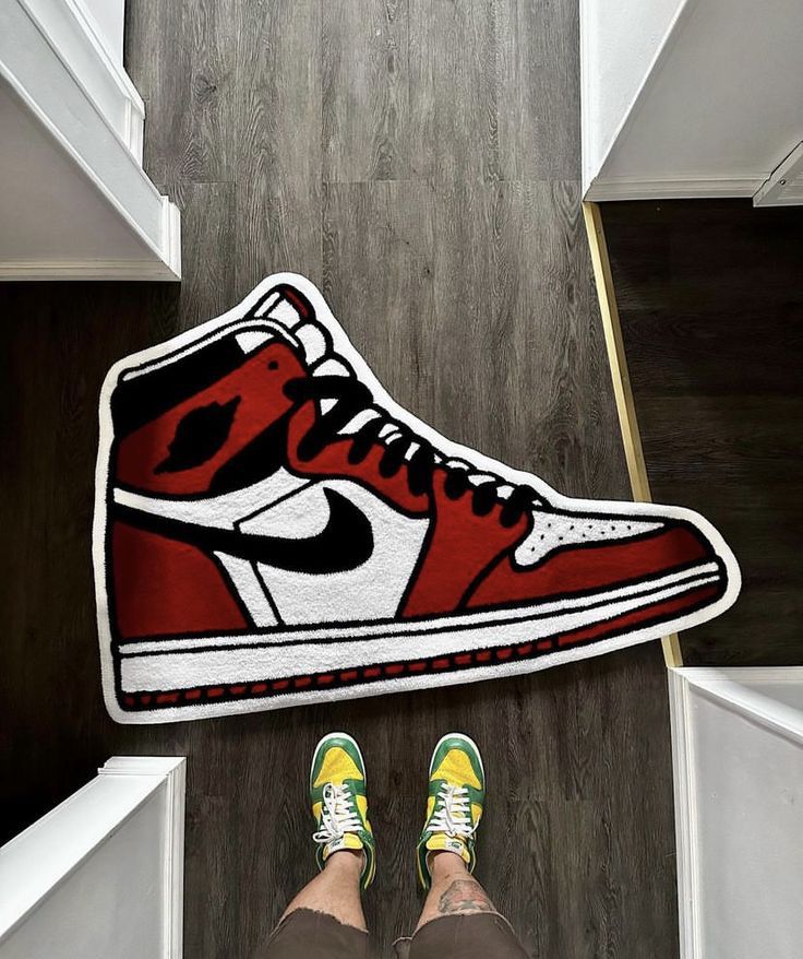 Una alfombra decorativa, con un borde blanco definido, modelada a la perfección como una zapatilla deportiva de corte alto, muy similar al icónico modelo Air Jordan 1 en la combinación de colores rojo (“Chicago” o “Bred”), blanco y negro. La alfombra está colocada en un piso de madera oscura, en un pasillo estrecho. En la parte inferior de la imagen se ven los pies de una persona calzada con zapatillas diferentes de color amarillo y verde, lo que proporciona una escala al tamaño de la alfombra