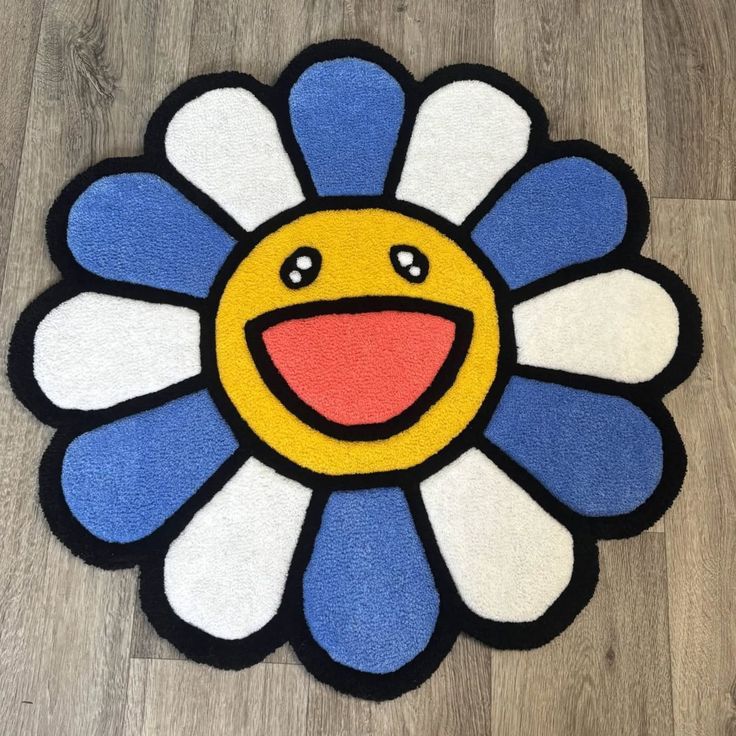 Alfombra de diseño artístico en forma de flor con pétalos grandes, alternando los colores blanco y azul. El centro de la flor es de color amarillo brillante con una cara feliz (ojos simples y boca roja abierta), al estilo de la obra de arte pop japonesa de Takashi Murakami. La alfombra está sobre un piso de madera laminada