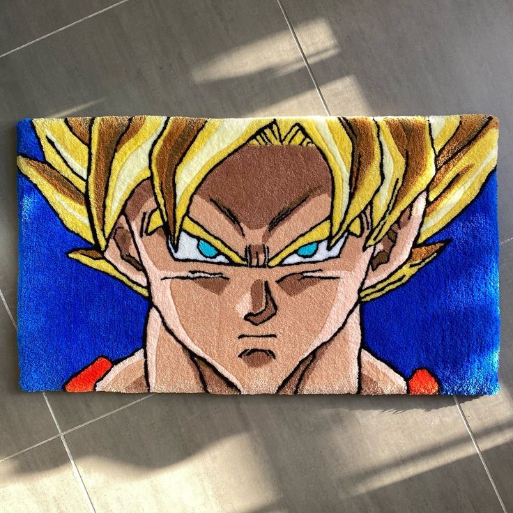 Una alfombra de formato rectangular que presenta un primer plano del rostro de Goku de Dragon Ball Z en su forma Super Saiyan. Se caracteriza por su cabello amarillo erizado y ojos azules/verdes intensos. El fondo es de un azul vibrante, destacando la tensión y el poder del personaje. Está colocada sobre baldosas grises y beige