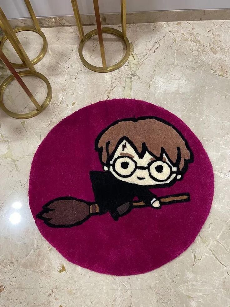 Una alfombra circular de pelo alto con un fondo de color magenta o fucsia vibrante. En el centro, se muestra una versión chibi (cabeza grande) de Harry Potter con su uniforme de Hogwarts, montando una escoba voladora. El personaje tiene sus gafas redondas y la cicatriz en forma de rayo. La alfombra está sobre un suelo de baldosas de mármol pulido