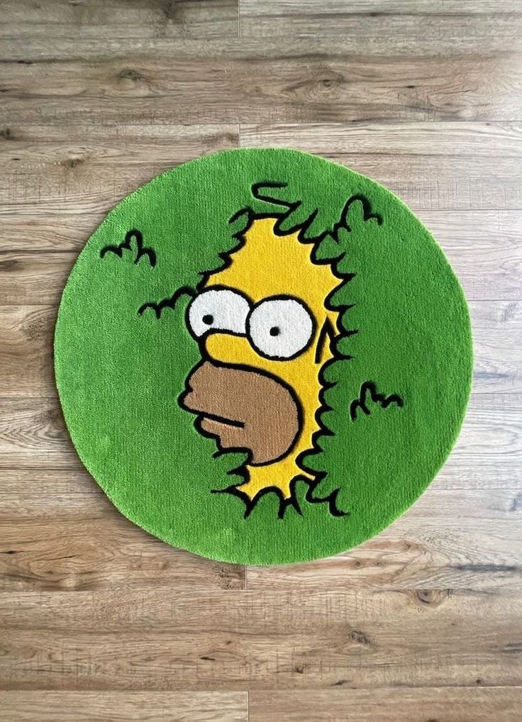 Alfombra redonda que captura la escena icónica del meme de “Homer Simpson desapareciendo en el arbusto” de la serie Los Simpson. La base es de un verde césped brillante, simulando el arbusto del que solo se ve la cara de Homer con una expresión de consternación o sorpresa, mirando hacia la izquierda. El contorno irregular en el verde simula las hojas, mientras que unos garabatos negros alrededor refuerzan el efecto de movimiento. Es una pieza de coleccionista o decoración para fans del humor y la cultura memética