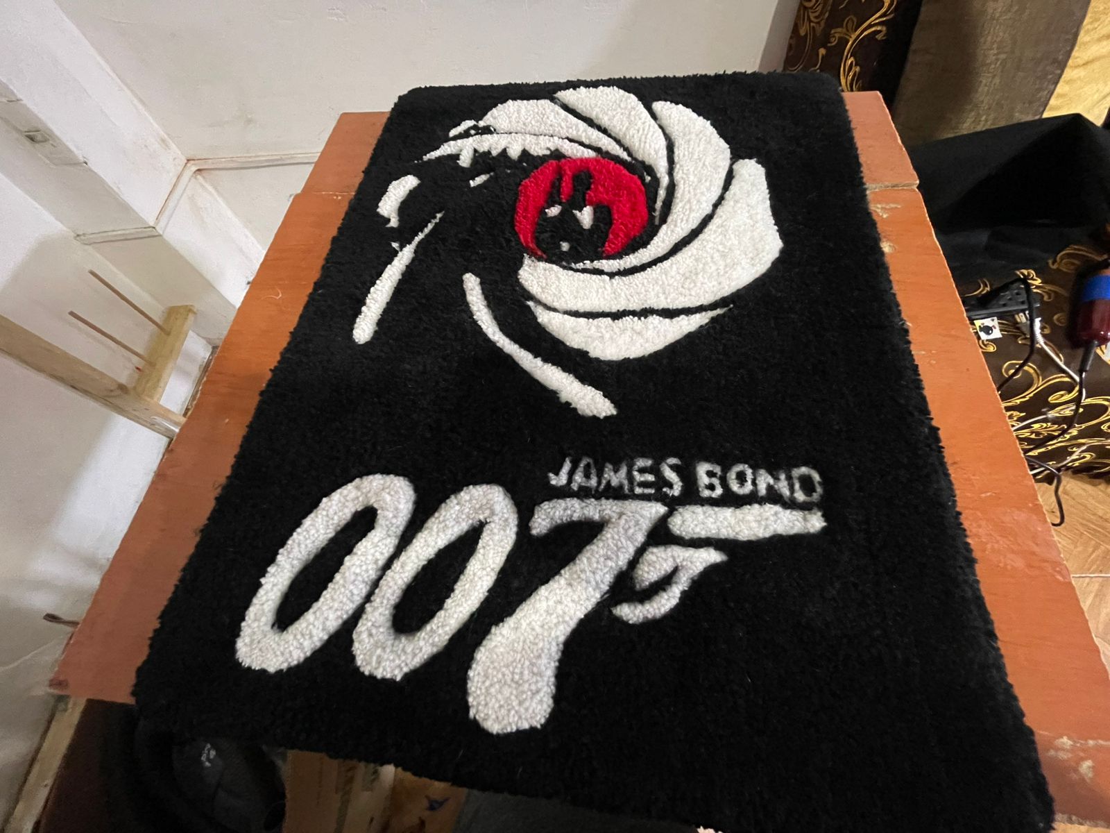 Una alfombra rectangular de color negro profundo con dos elementos icónicos de la franquicia James Bond. En la parte superior, se encuentra el diseño estilizado de la mira de cañón en blanco y rojo. En la parte inferior, el gran número “007” en blanco con un sombreado gris, y el texto “JAMES BOND” justo encima en una fuente más pequeña. La alfombra está colocada sobre una superficie de madera, probablemente en proceso de fabricación o exhibición artesanal