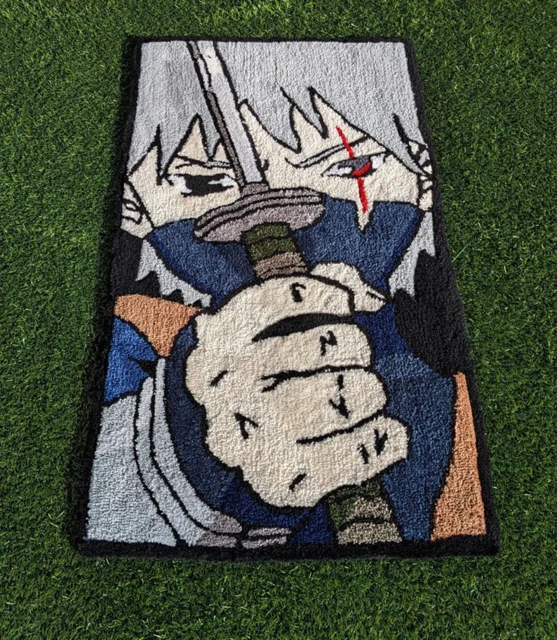 Alfombra rectangular que muestra un primer plano del personaje Kakashi Hatake de la serie Naruto. Se le ve sosteniendo una espada o katana, con una expresión seria. Su ojo izquierdo está cubierto por su protector ninja o bandana, revelando una cicatriz roja sobre su ojo derecho. Viste su uniforme ninja y la alfombra está colocada sobre un césped sintético verde