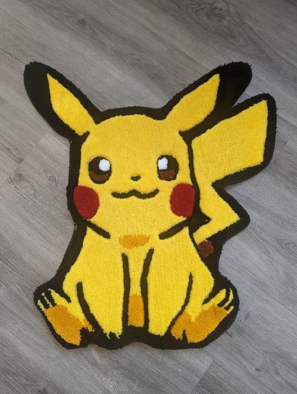 Alfombra con la figura de Pikachu, el Pokémon eléctrico, sentado con una expresión feliz.