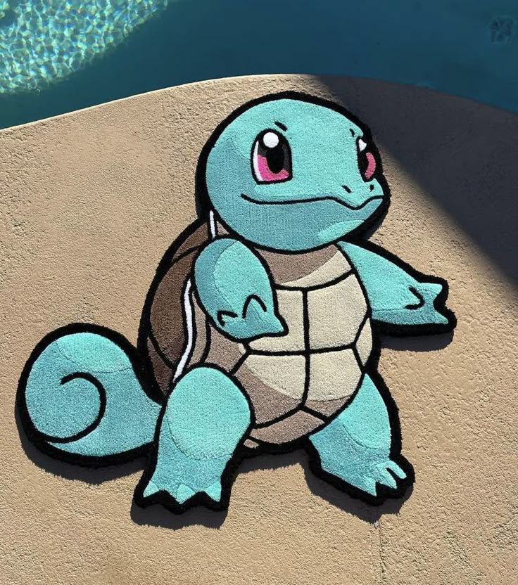 Alfombra con la forma del Pokémon inicial de tipo Agua, Squirtle. El diseño utiliza un tono azul turquesa brillante para el cuerpo y tonos de marrón y crema para el caparazón. La pose es activa, con una mano levantada, y el rostro tiene una expresión de concentración o determinación. Los ojos tienen un sutil toque de color rosa. Es una pieza de decoración gamer que evoca nostalgia por la primera generación de Pokémon