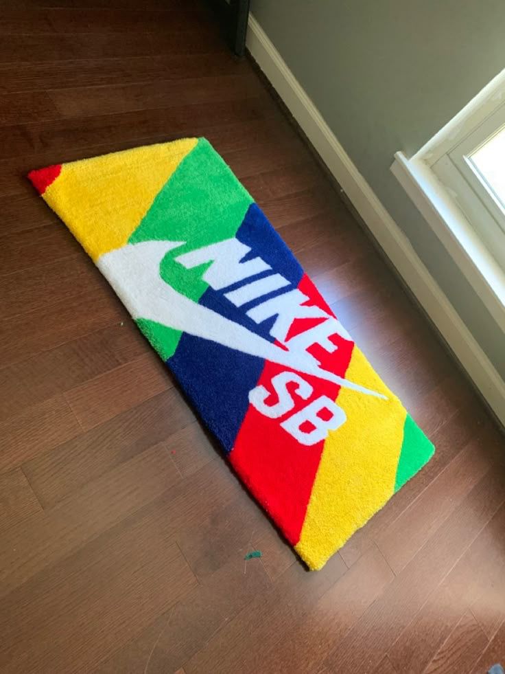 Alfombra de formato rectangular alargado que presenta un vibrante diseño de bloques de color (rojo, amarillo, verde, azul) que convergen. Sobre este fondo, en la sección central, se sitúa el logo de Nike (Swoosh) y la palabra “SB” en color blanco, ambos con un borde oscuro. La alfombra está sobre un piso de madera marrón pulida, cerca de una pared gris y una ventana, y parece ser una variación del diseño de una toalla o mat de la marca