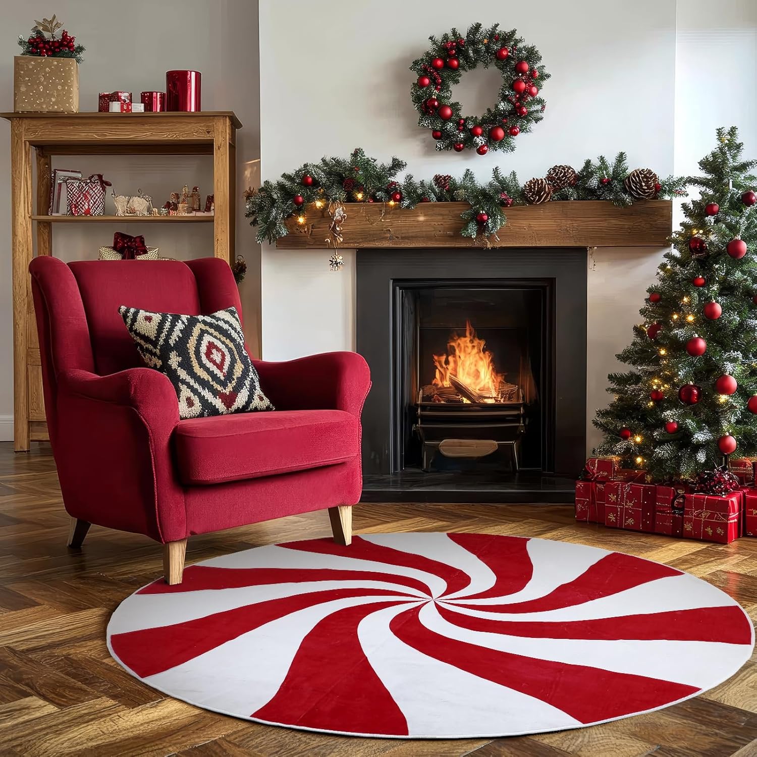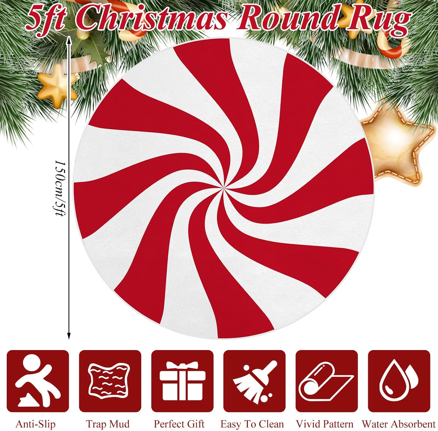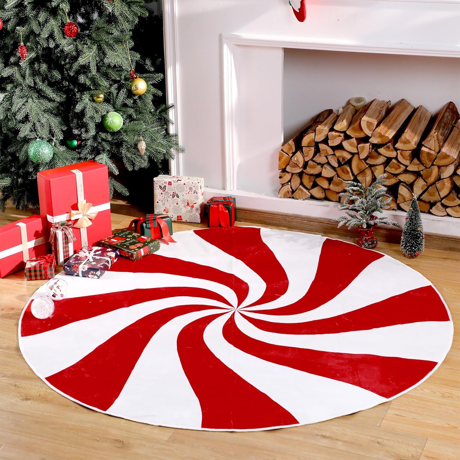 Alfombra redonda de Navidad: recibirás 1 paquete de alfombra redonda de Navidad, características con diseño clásico y vibrante, con color brillante de rojo y blanco, viene con patrón de piruleta, añadiendo un ambiente duro y dulce para tu decoración de interiores de Navidad
