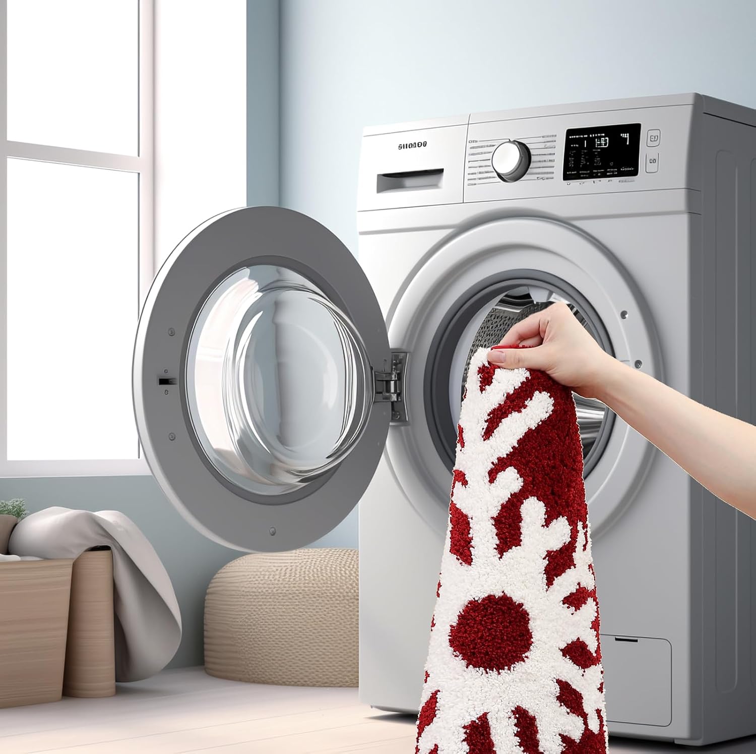 DECORACIONES DE BAÑO DE NAVIDAD: La alfombra de baño con temática de invierno combina una silueta rectangular simple para crear el punto focal perfecto para todas las festividades de invierno. Los contornos minimalistas de las imágenes del invierno deleitan de una alegría y fondo rojo