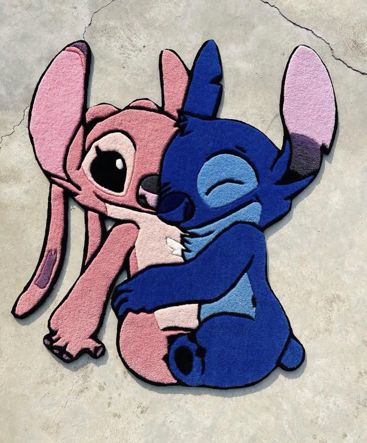 Alfombra de forma libre que captura una tierna escena de Stitch (Experimento 626) y Angel (Experimento 624) abrazándose. Stitch, en azul intenso, aparece con los ojos cerrados en un gesto de afecto, mientras que Angel, en tonos de rosa, lo mira con ternura. El diseño utiliza colores vivos y contornos definidos. Es una pieza ideal para decoración romántica, habitaciones infantiles o para los fans de Disney