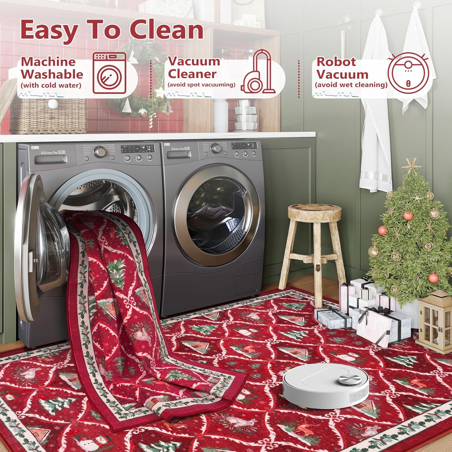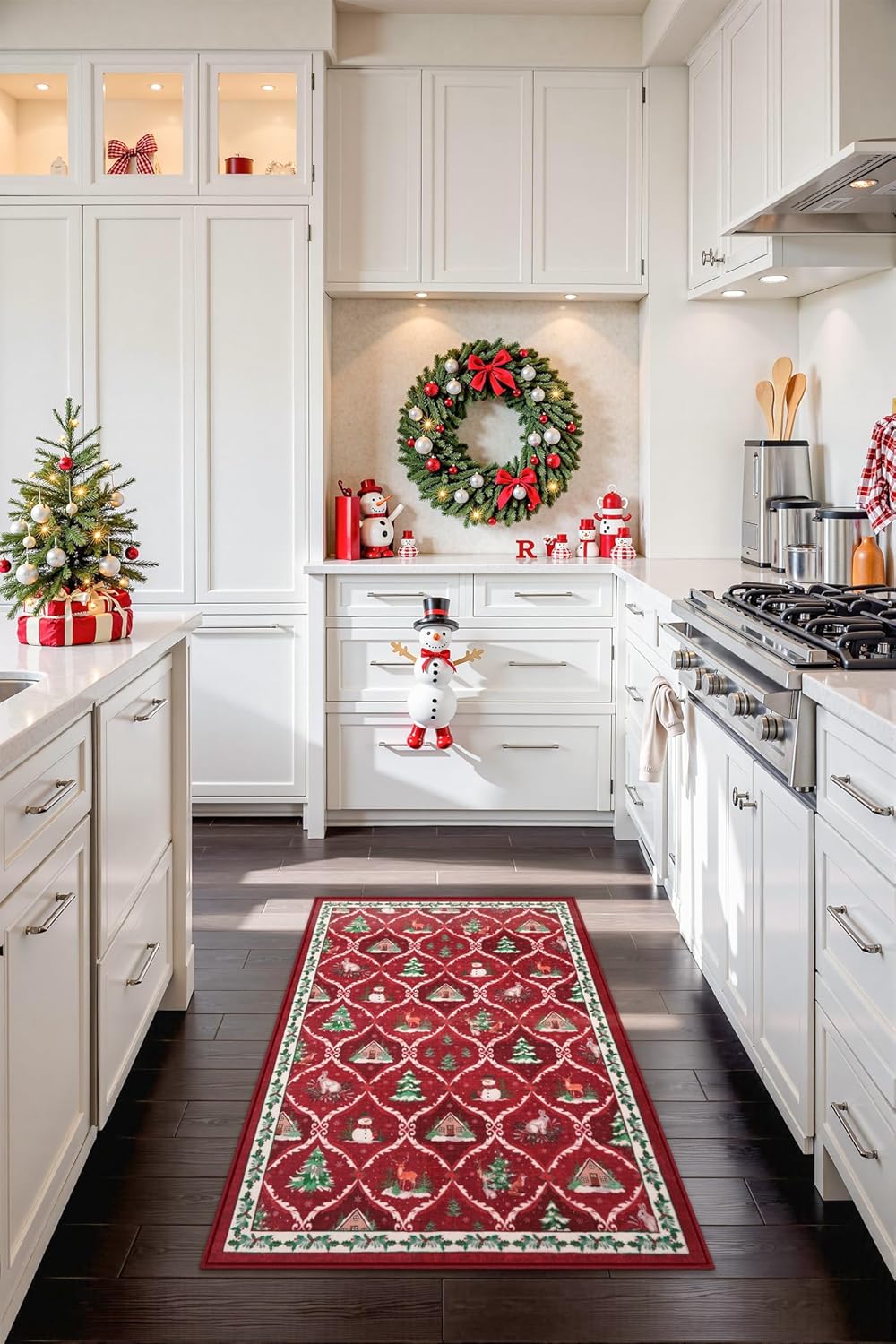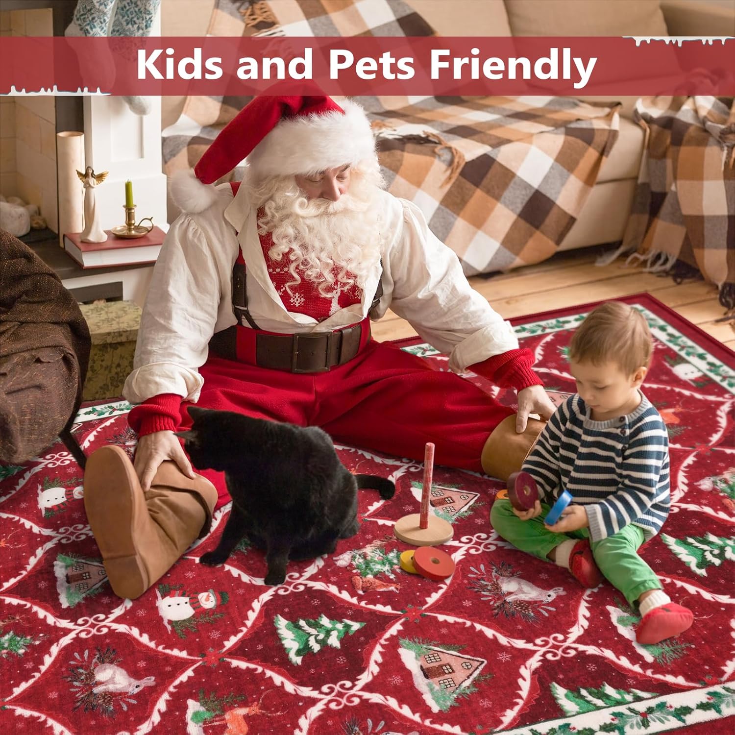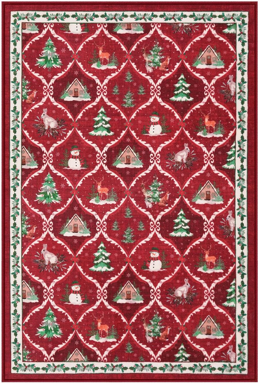 Diseños festivos: los colores vibrantes y los diseños intrincados crean un ambiente alegre, lo que lo convierte en una pieza central ideal para reuniones familiares y celebraciones navideñas. Con hermosos patrones de elementos navideños como pinos, renos, muñecos de nieve y casas, la alfombra será el complemento adecuado para tu decoración navideña