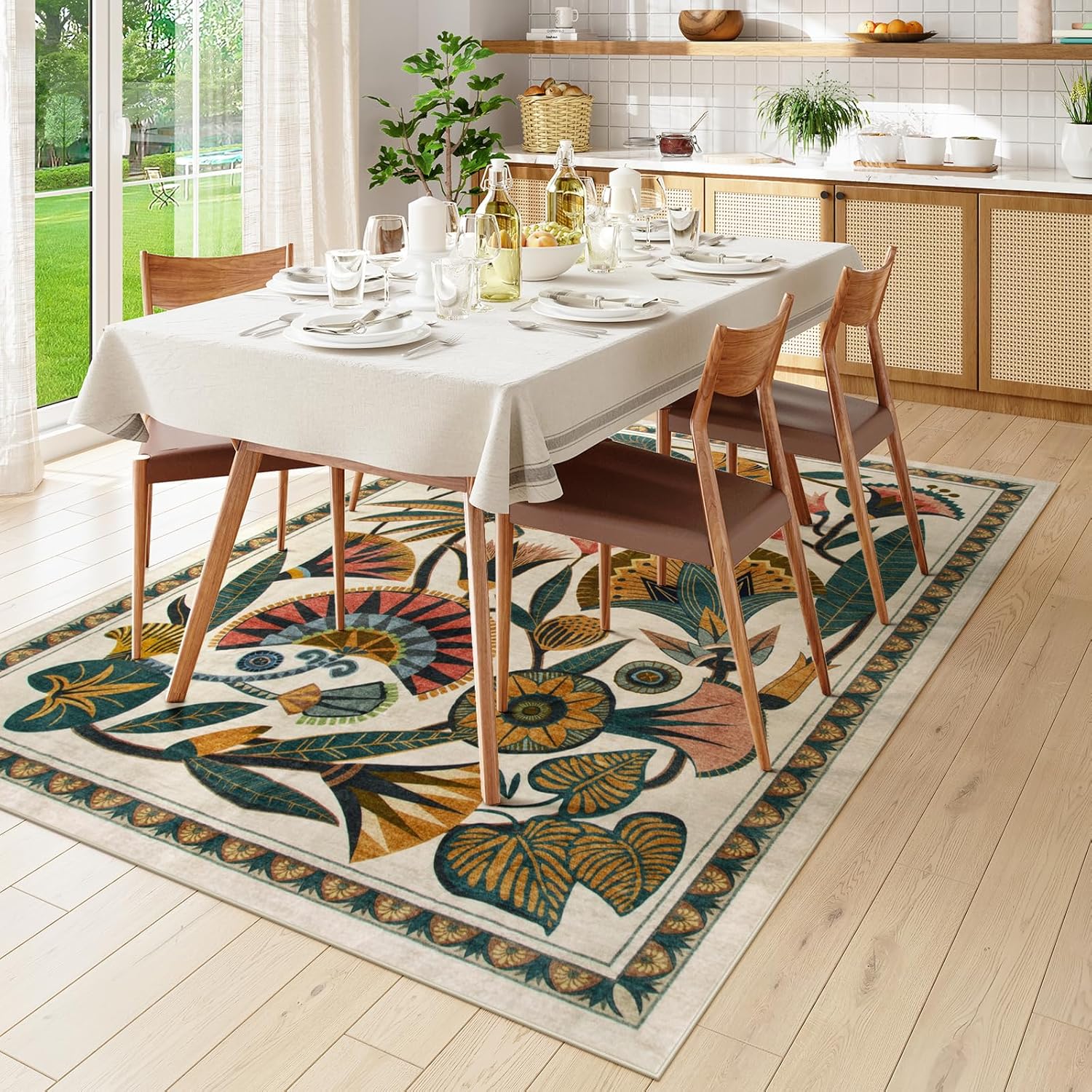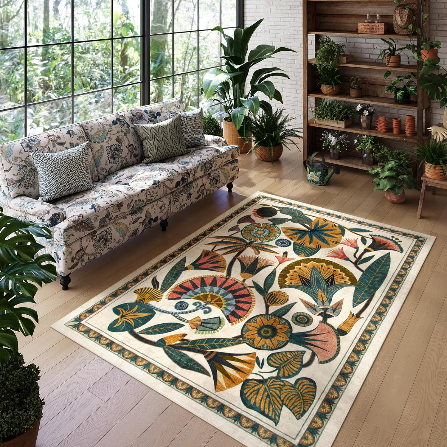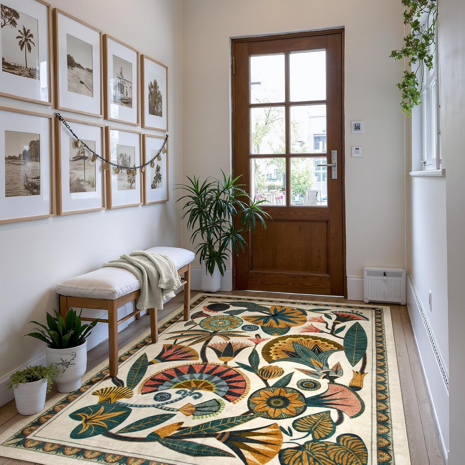 Alfombra floral suave y ultrafina: esta alfombra bohemia ofrece comodidad de felpa con un perfil delgado ligero de 0.2 (aprox. 0.5 cm). Se desliza fácilmente debajo de puertas y muebles, perfecto para espacios reducidos con puertas correderas. Combina suavidad descalzo con un elegante diseño espacial