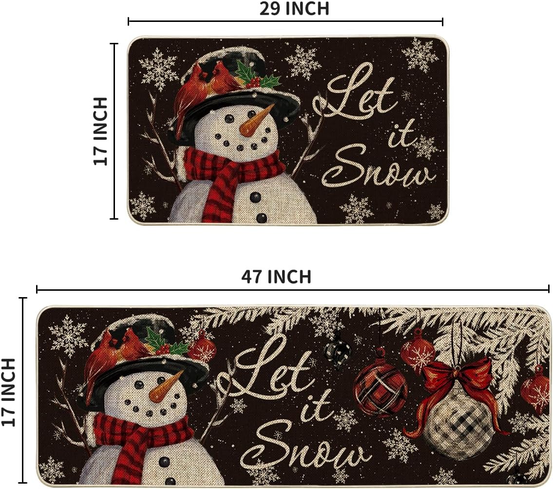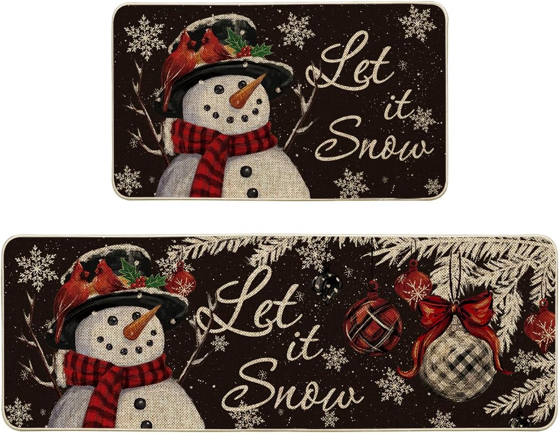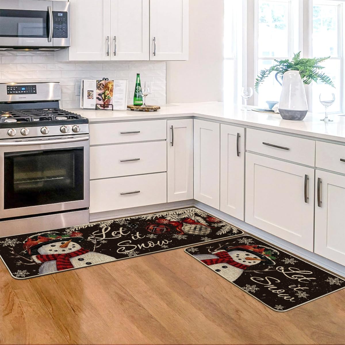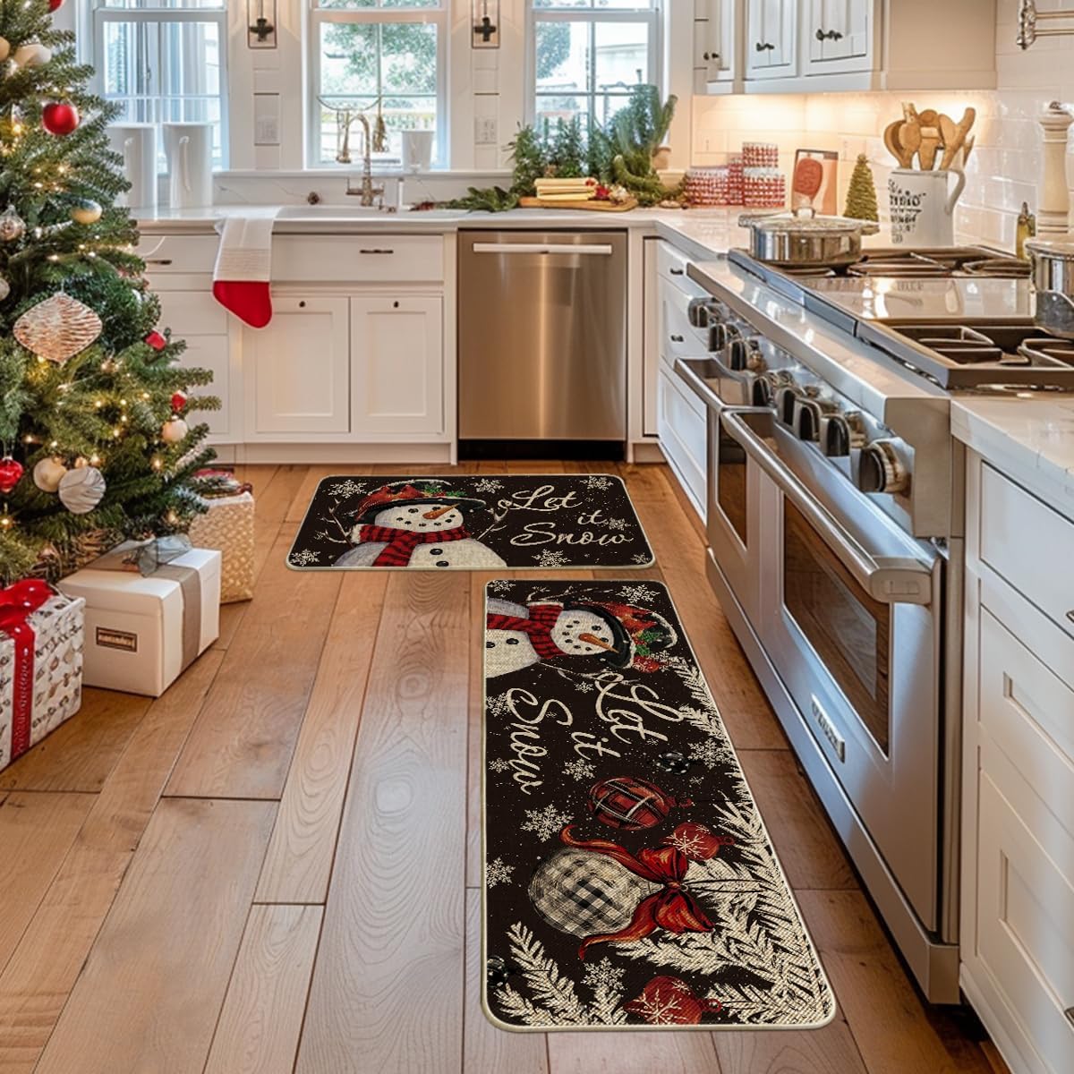 Artoid Mode Juego de 2 tapetes de cocina de Navidad con diseño de muñeco de nieve y copo de nieve negro, decoración del hogar, alfombras de cocina de bajo perfil para piso, 17 x 29 y 17 x 47 pulgadas