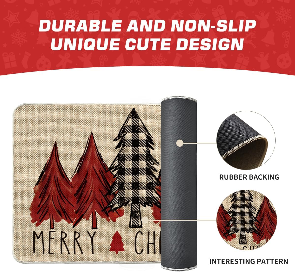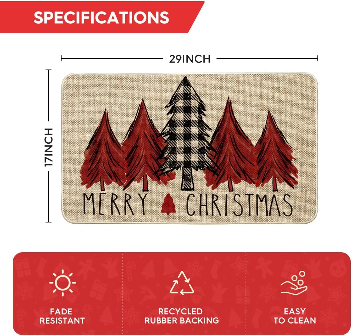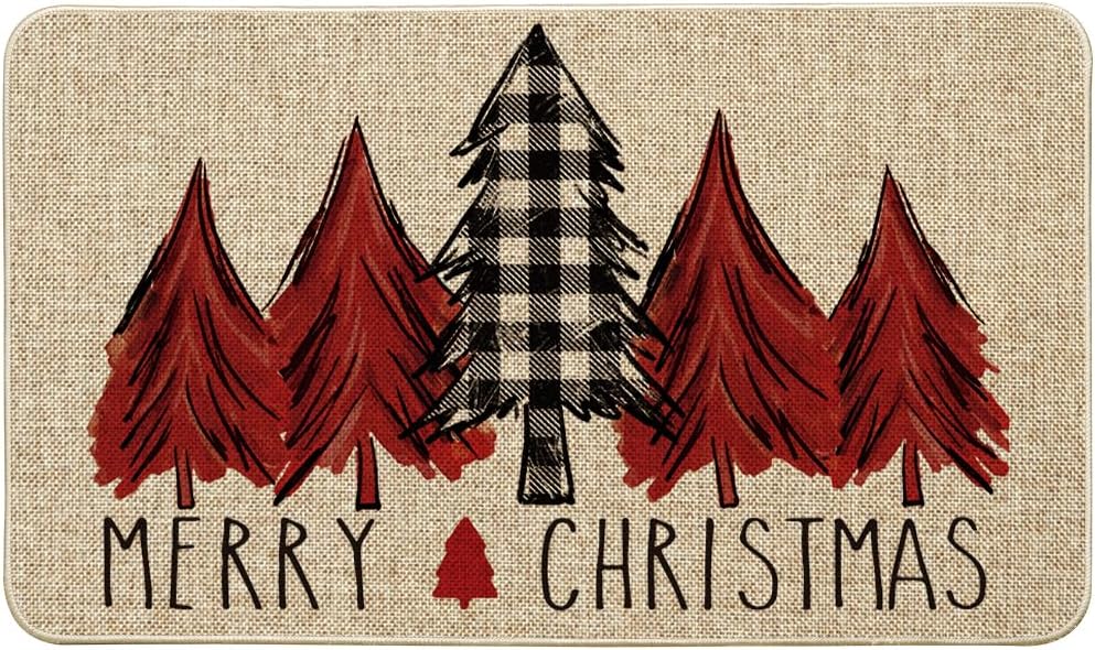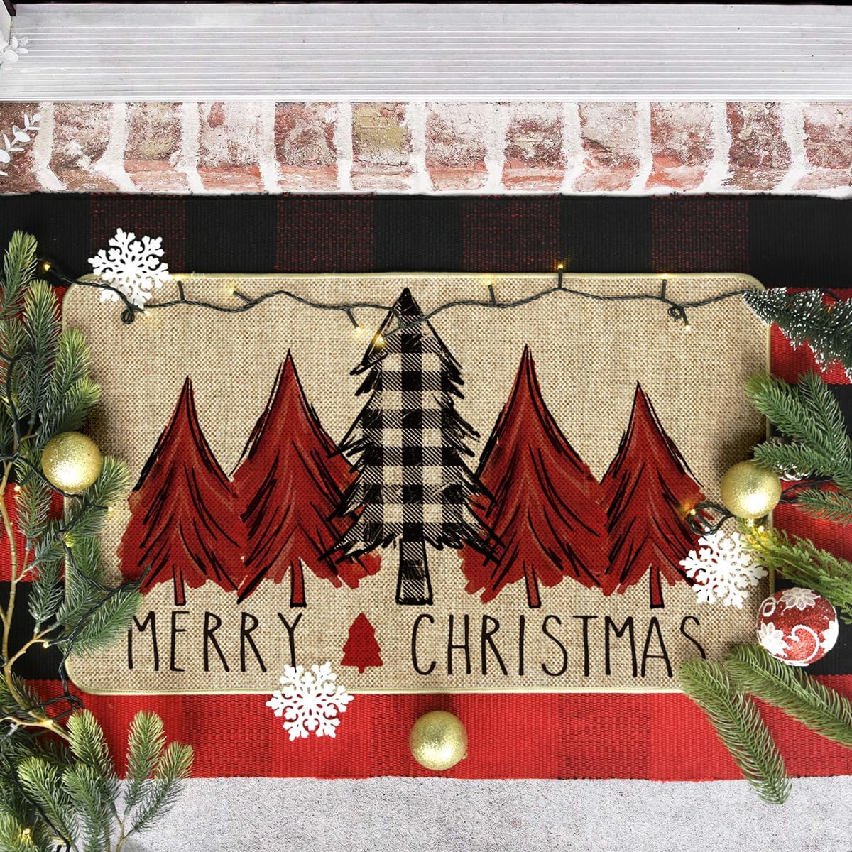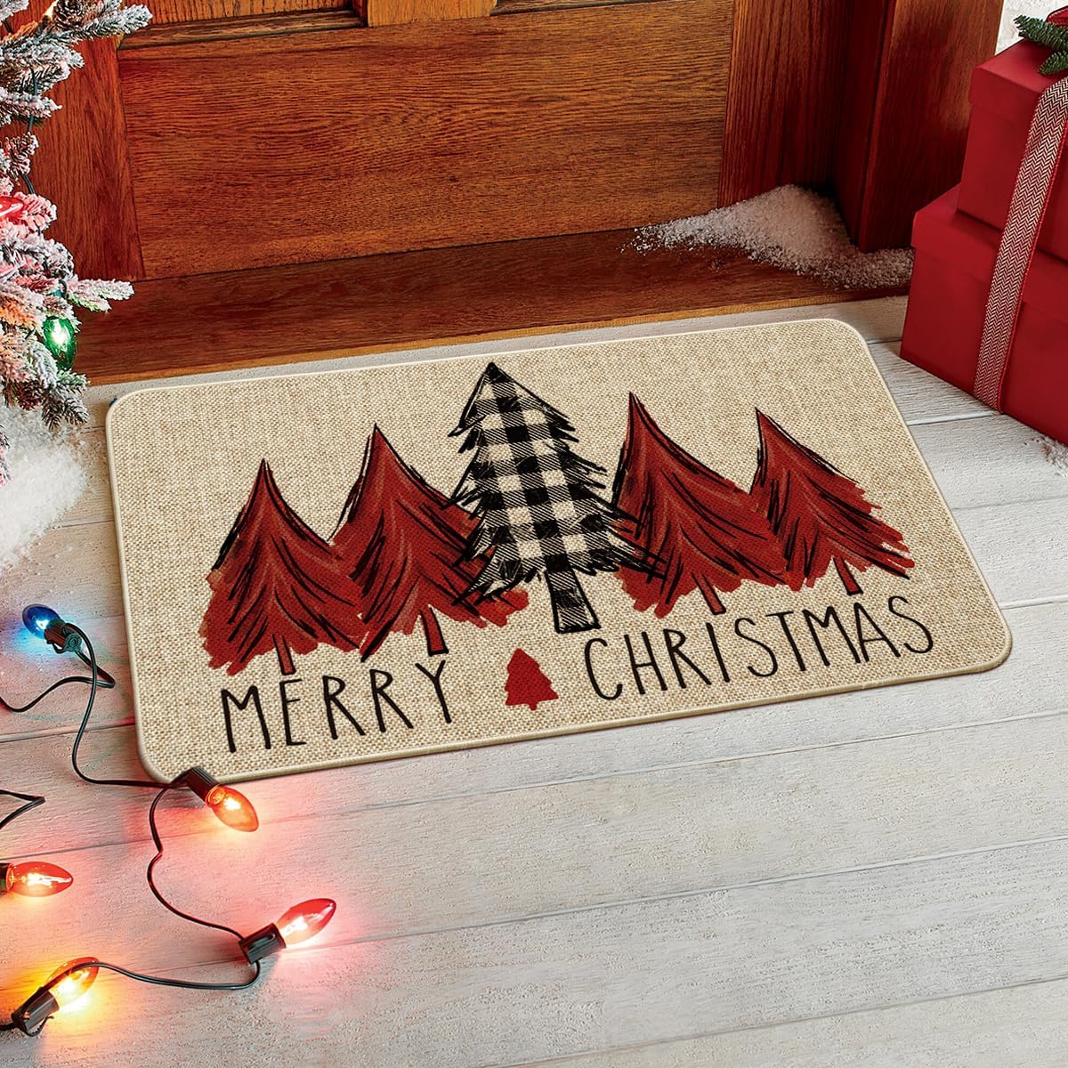 Artoid Mode Tapete rojo con diseño de árboles de Navidad, decoración del hogar de invierno de perfil bajo, tapete de puerta para interiores y exteriores, 17 x 29 pulgadas