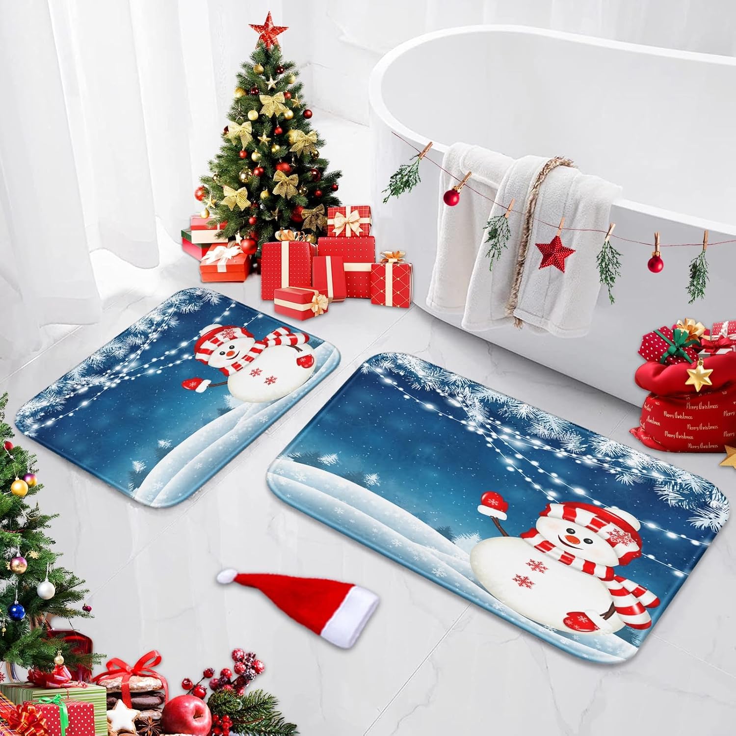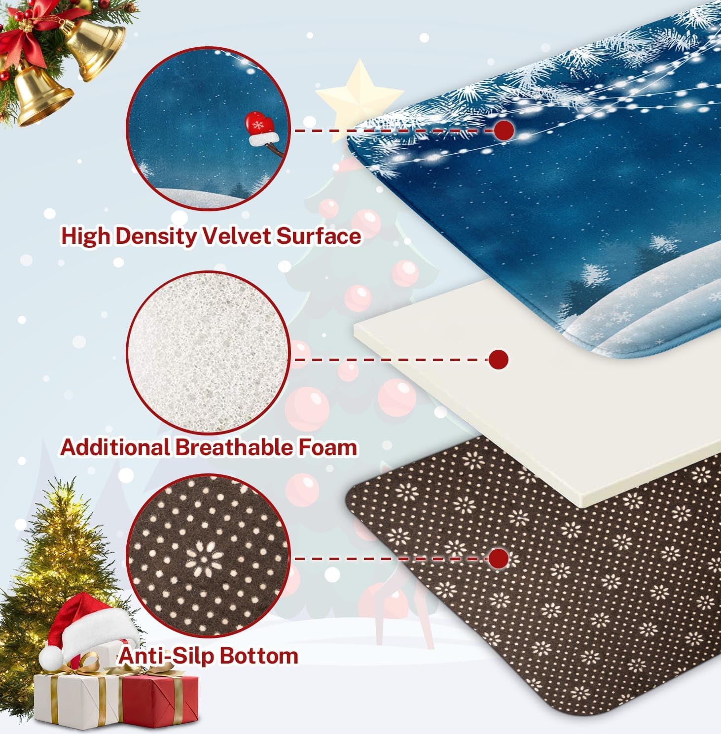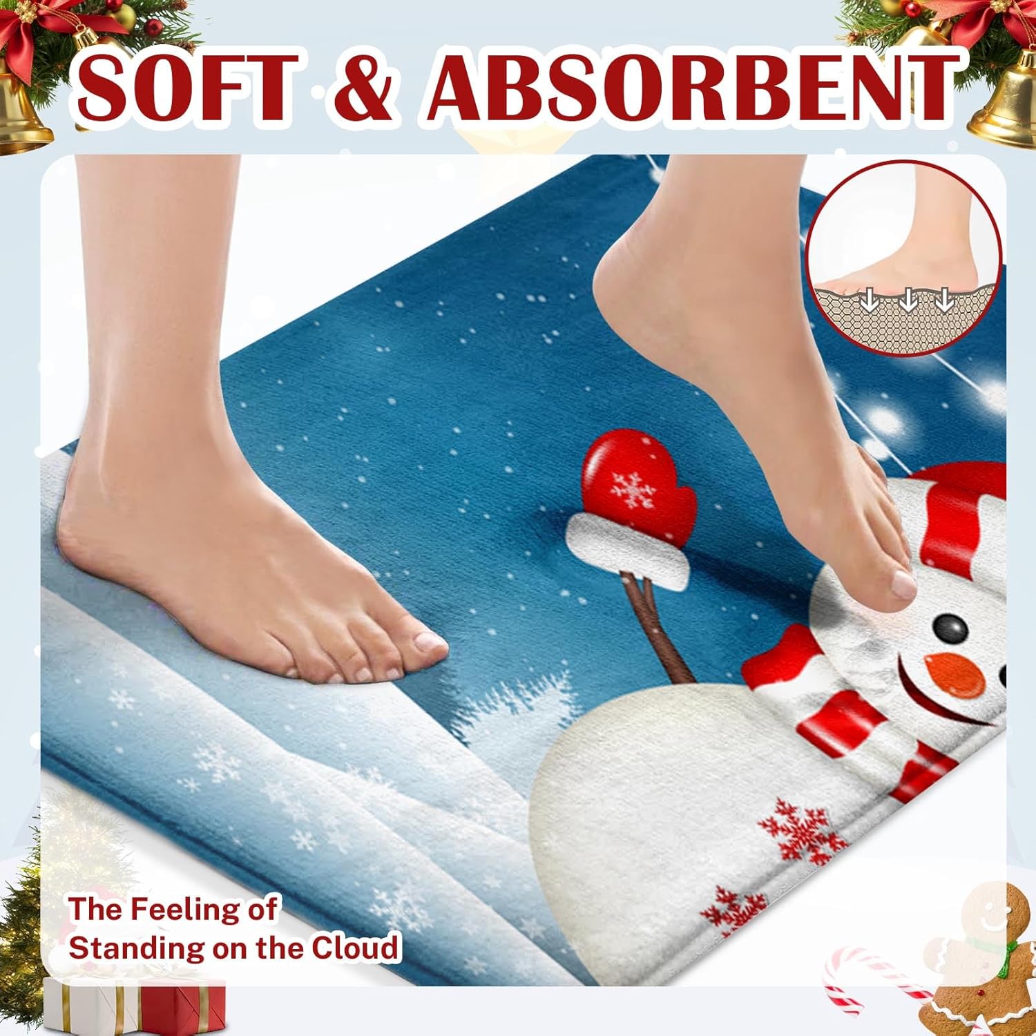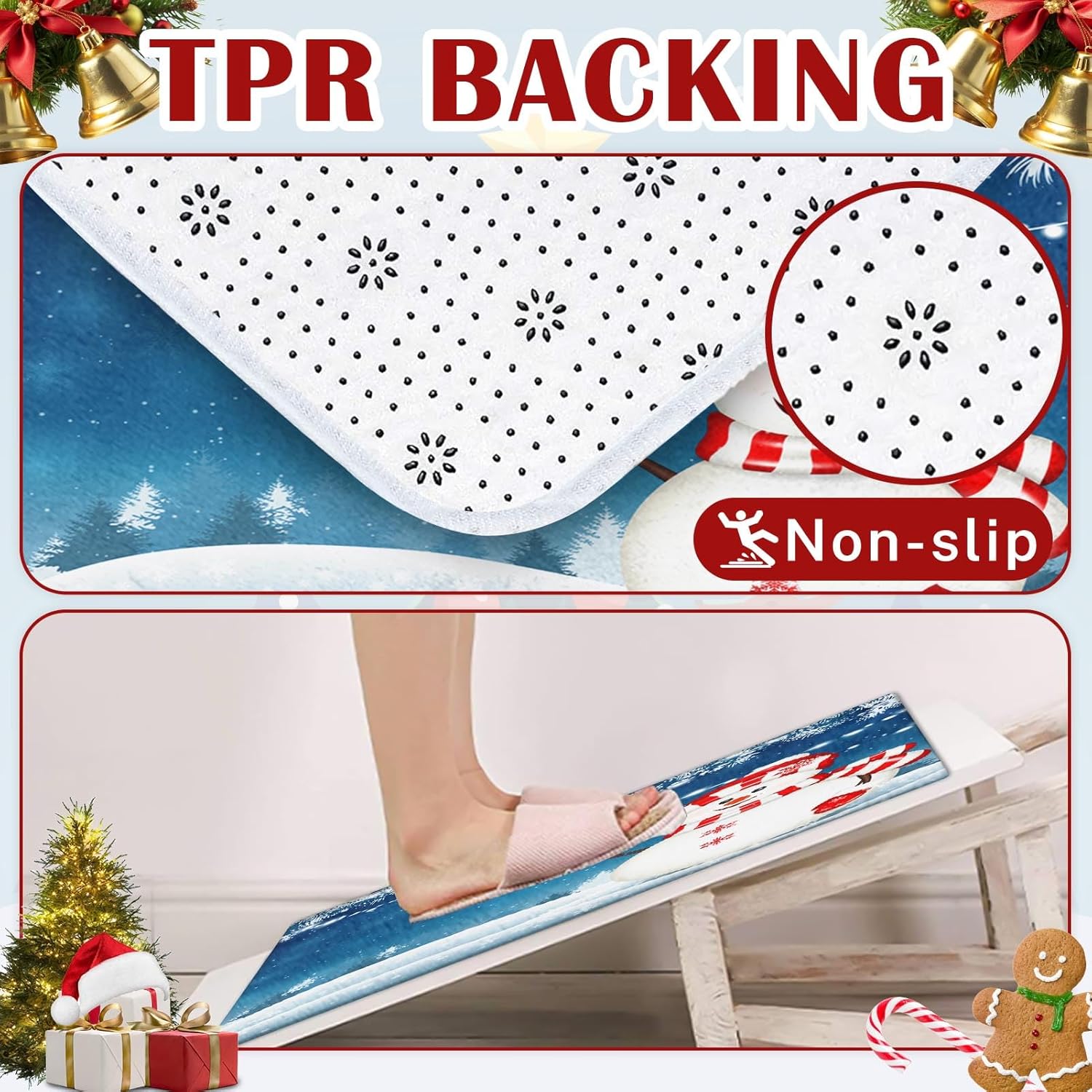 Material: este juego de alfombras de baño de Feliz Navidad está hecho de microfibra ultra suave, relleno de espuma viscoelástica innovadora. El tapete de baño mejorado es más grueso que los tapetes de baño normales. Habrá una sensación de apoyo y más comodidad cuando pises sobre él. Protege tus pies del suelo frío al mismo tiempo que protege tu suelo de la humedad