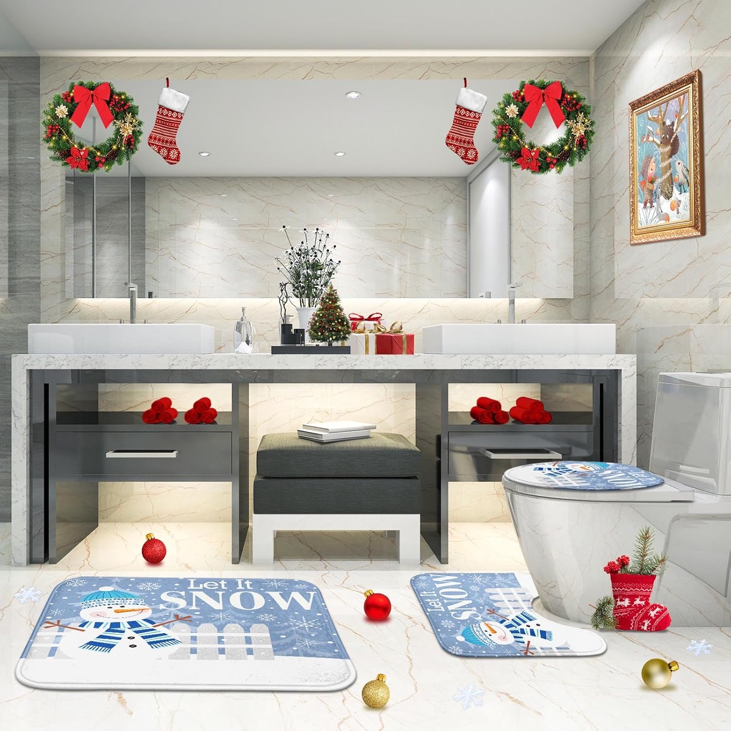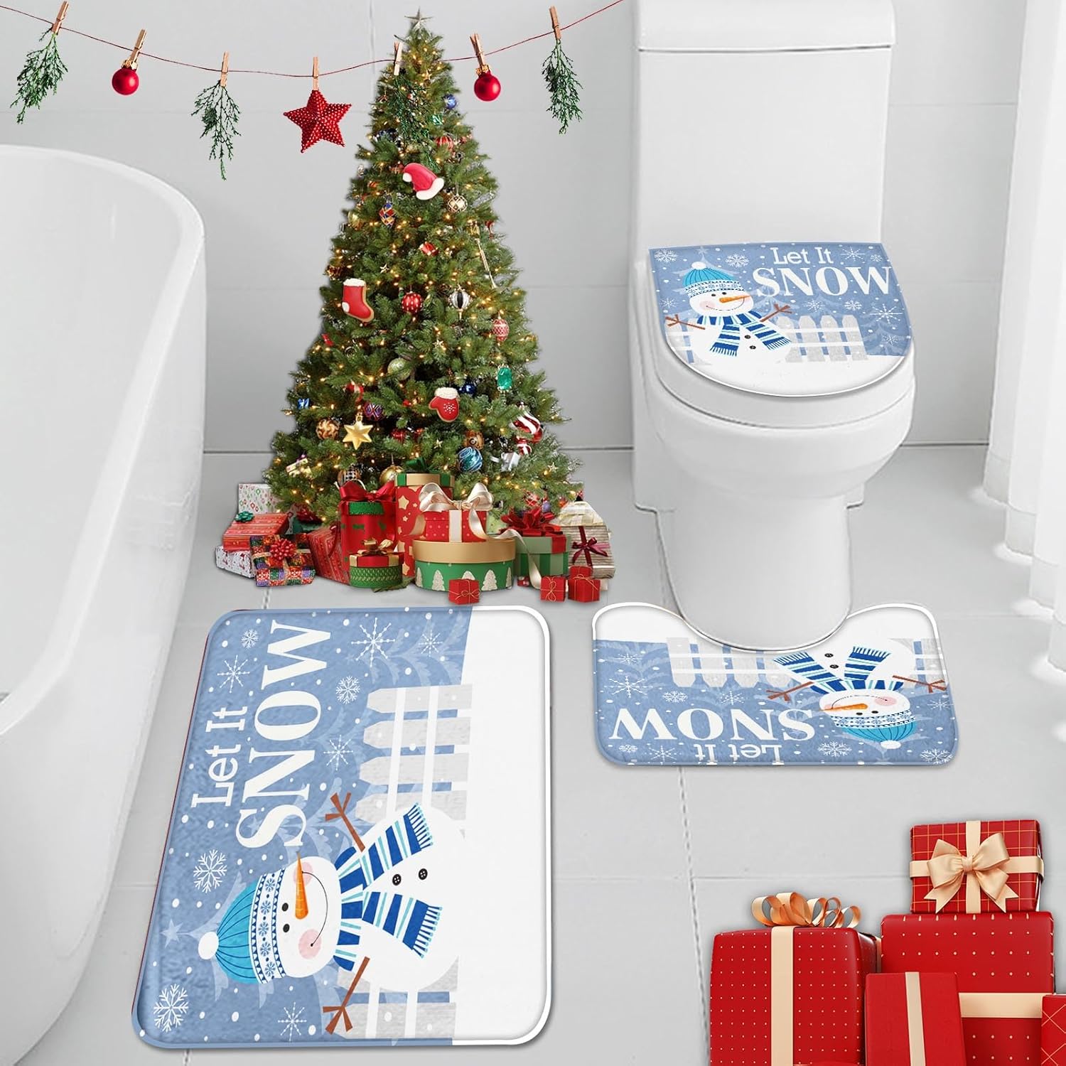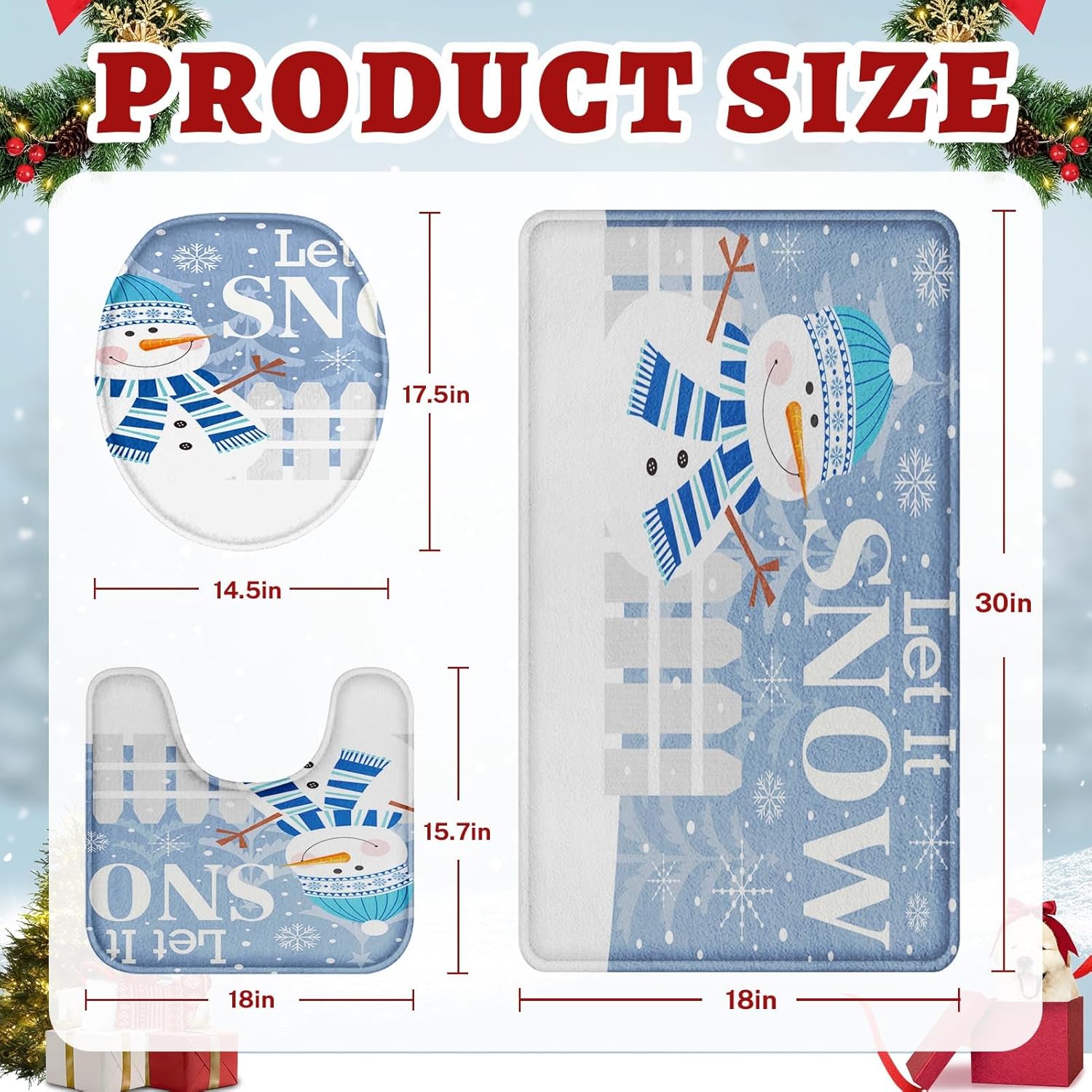 Arttown Juego de 3 tapetes de baño con diseño de muñeco de nieve de Feliz Navidad, juego de 3 tapetes de baño con diseño de copo de nieve azul invernal para baño, cubierta lavable antisedas,