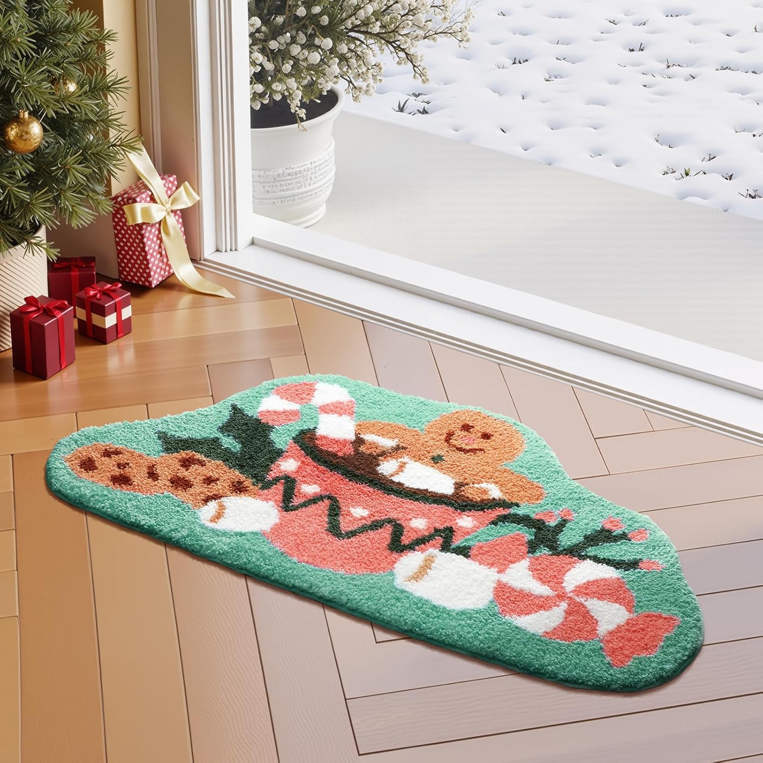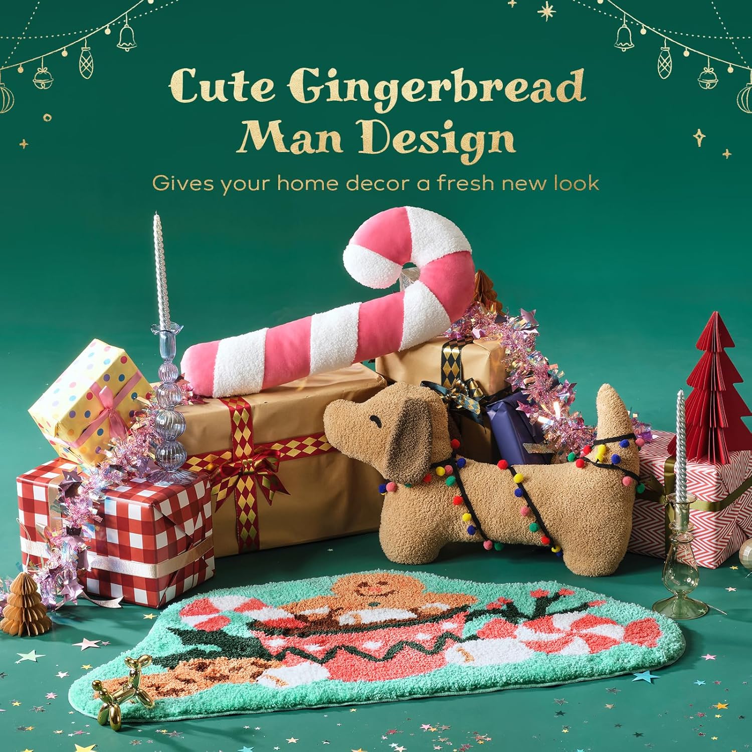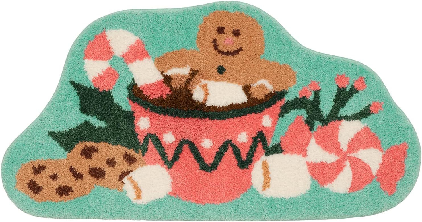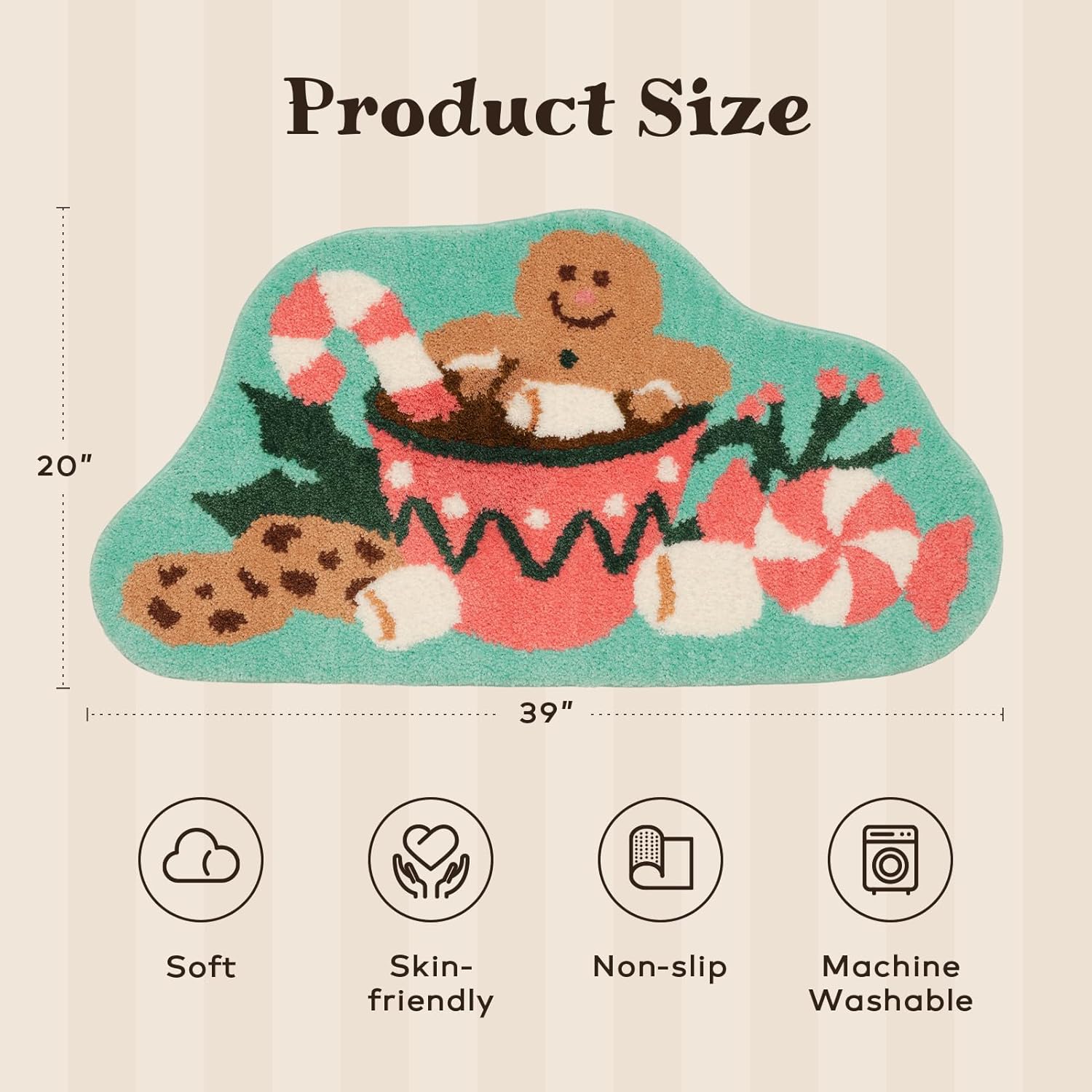 【Alfombra de postre de hombre de jengibre】 Esta encantadora alfombra de Navidad cuenta con un divertido hombre de jengibre que se asoma de una deliciosa taza de postre, rodeado de diseños festivos con temática de dulces.