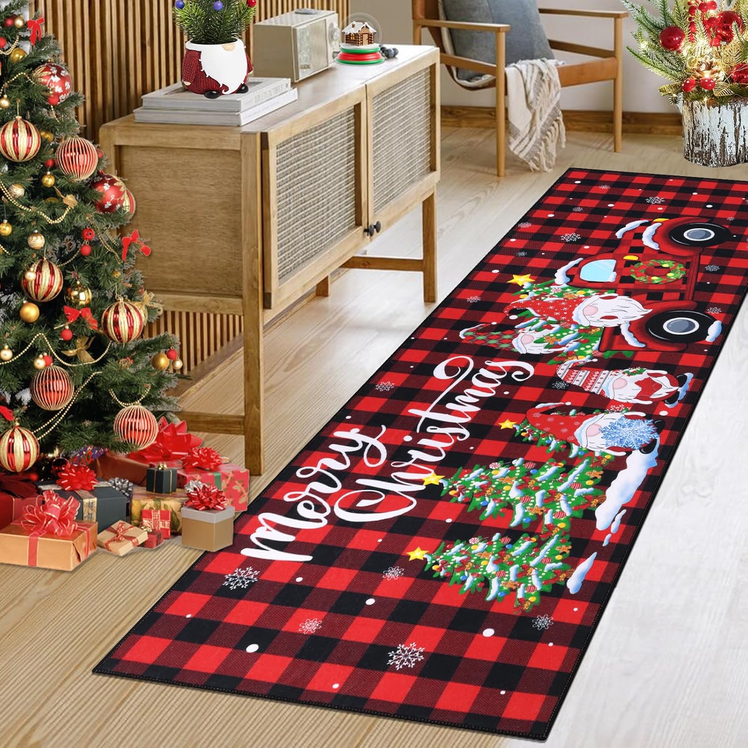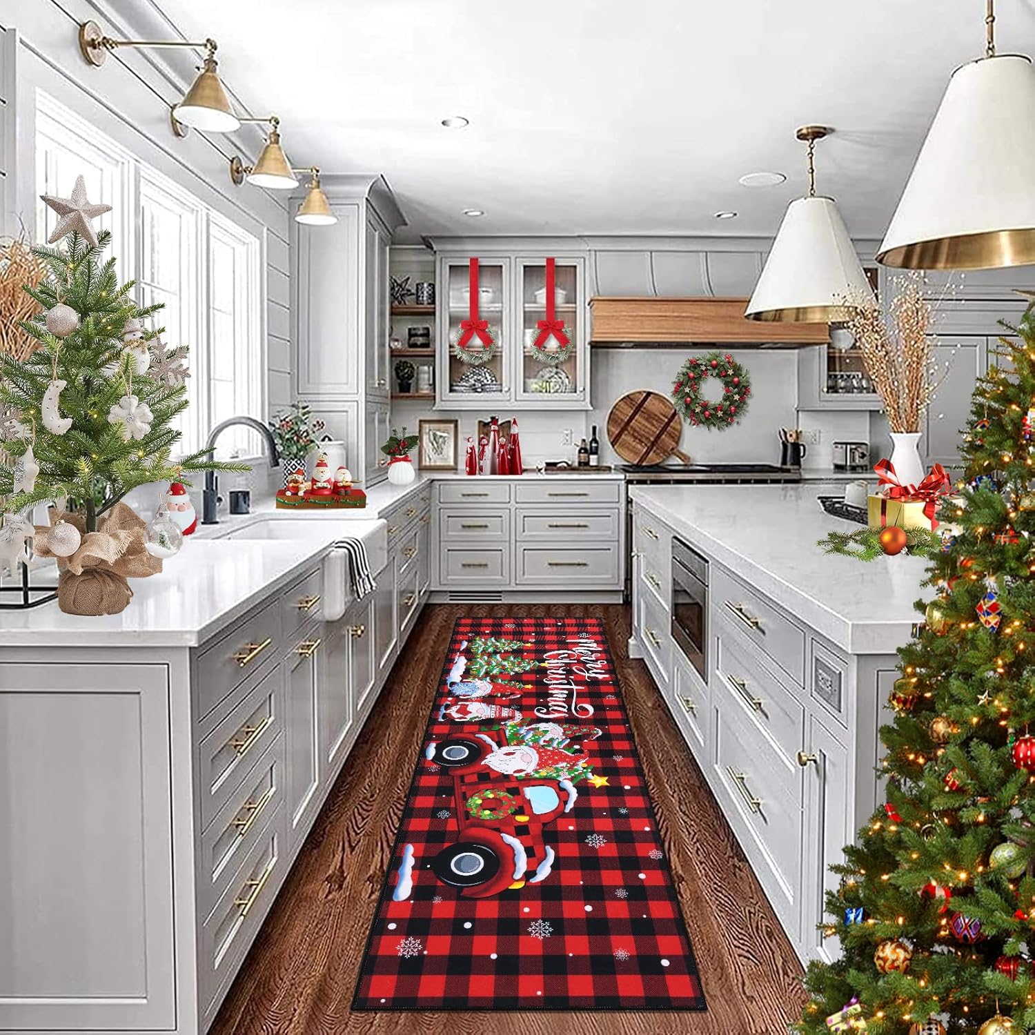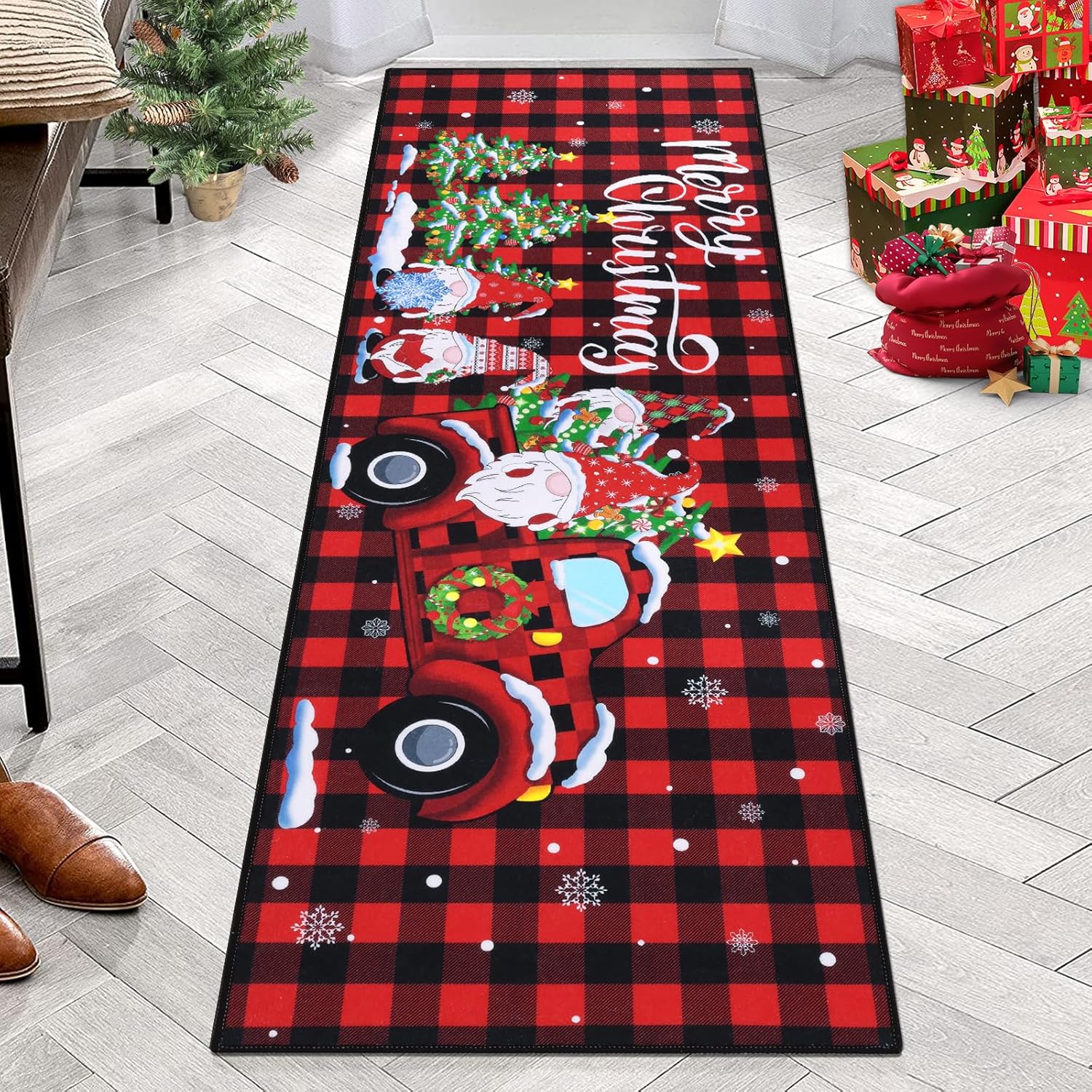 Alfombra de pasillo de Navidad de diseño único: esta alfombra de corredor de Navidad está decorada con figuras de Navidad, árboles de Navidad, autos y otros elementos, además de un fondo a cuadros negros y rojos, haciendo que toda la alfombra se vea divertida y linda. Esta cálida y suave alfombra de Navidad llega a tu hogar para crear un fuerte ambiente festivo.