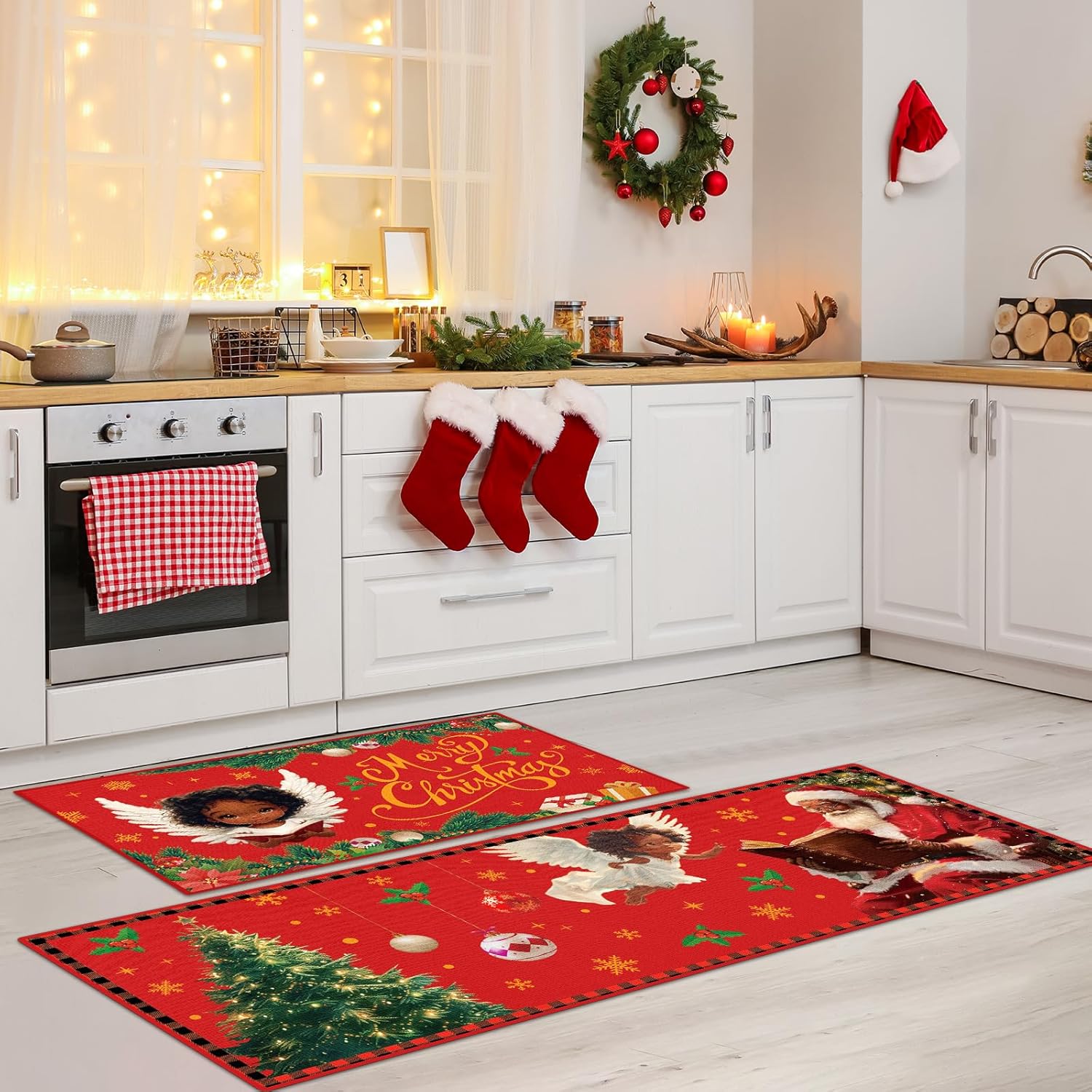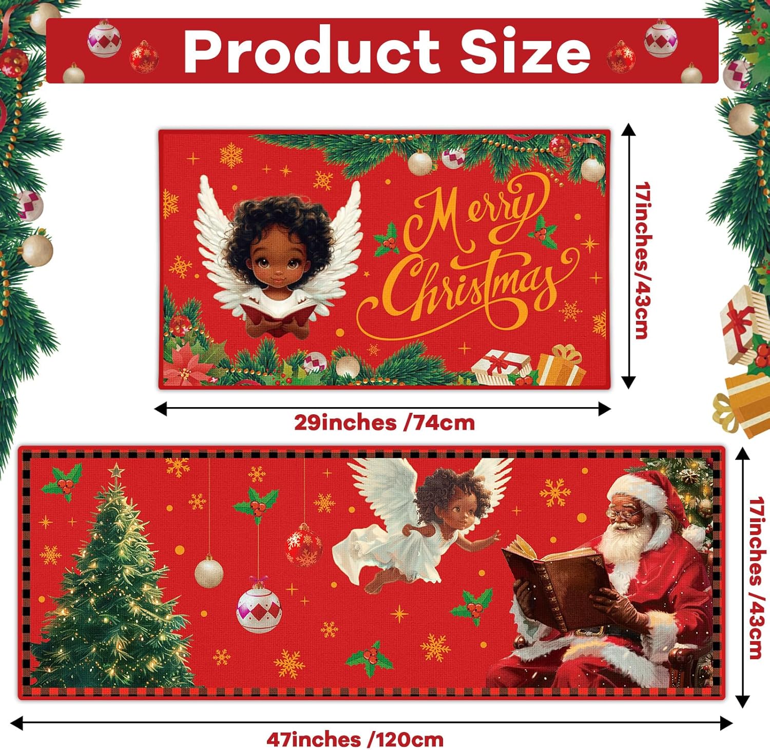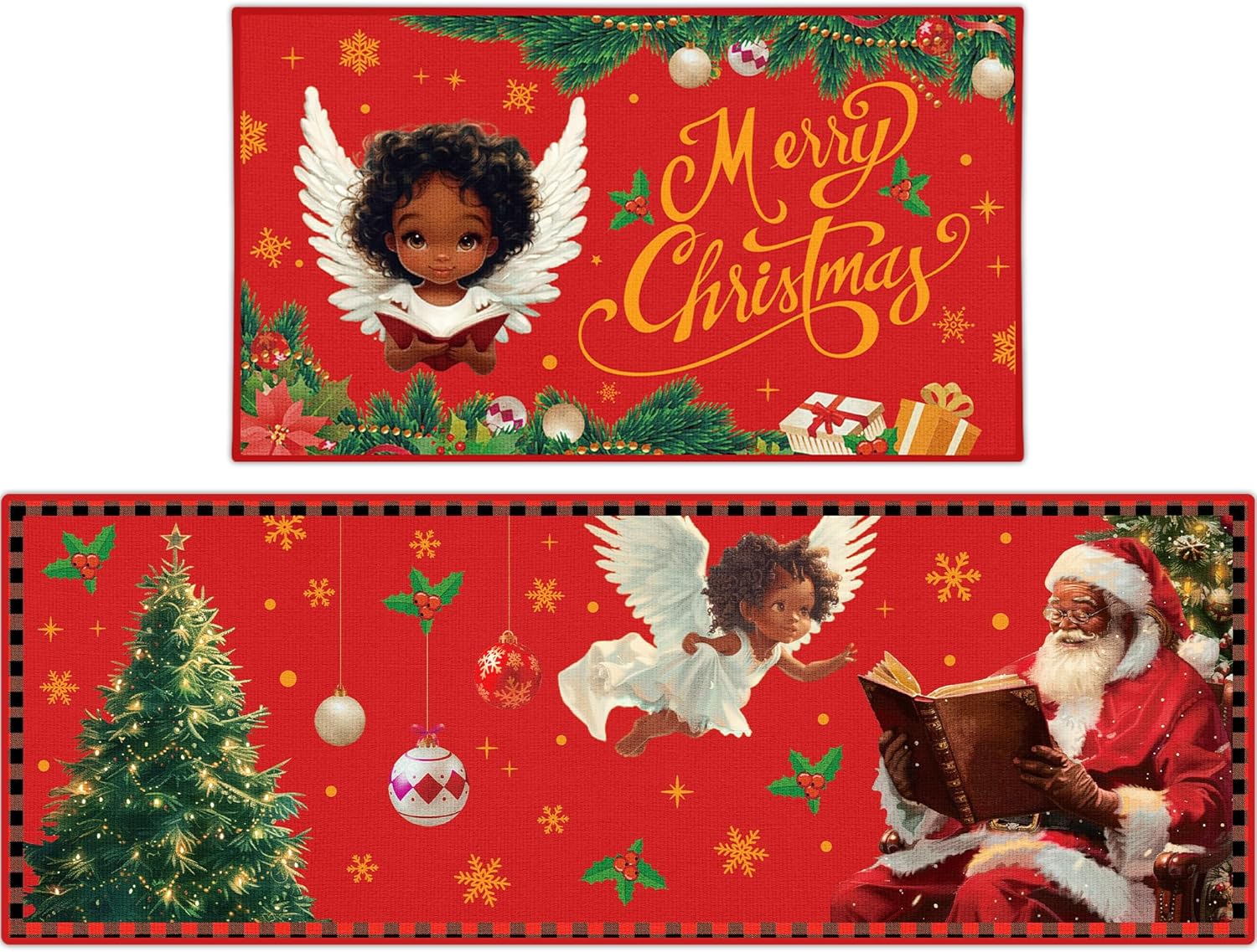 Decoración navideña para el hogar: el juego de tapetes de cocina de Navidad está diseñado con elementos clásicos de Navidad, impresos con las palabras [Feliz Navidad] y patrones de Papá Noel, árbol de Navidad, ángeles. La alfombra de cocina y los felpudos de Papá Noel afroamericano añadirán instantáneamente un fuerte ambiente festivo a tu hogar.