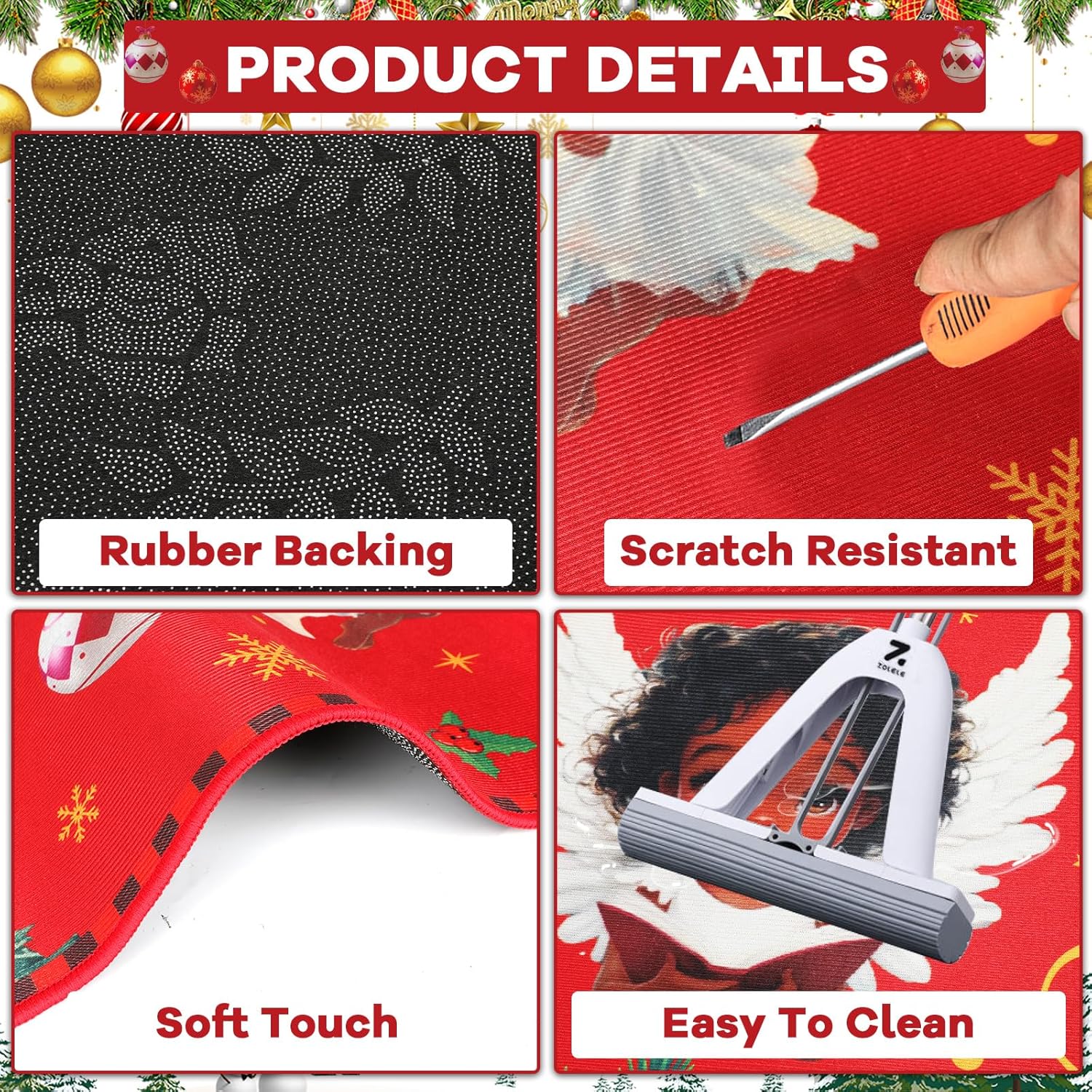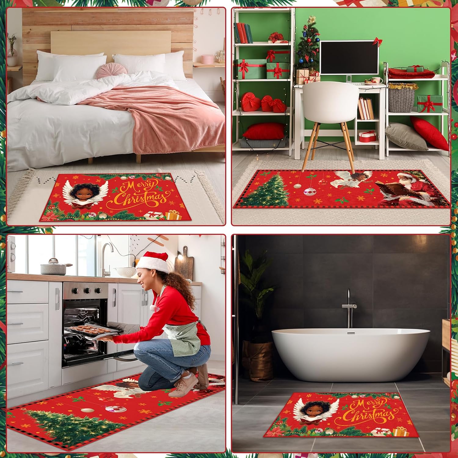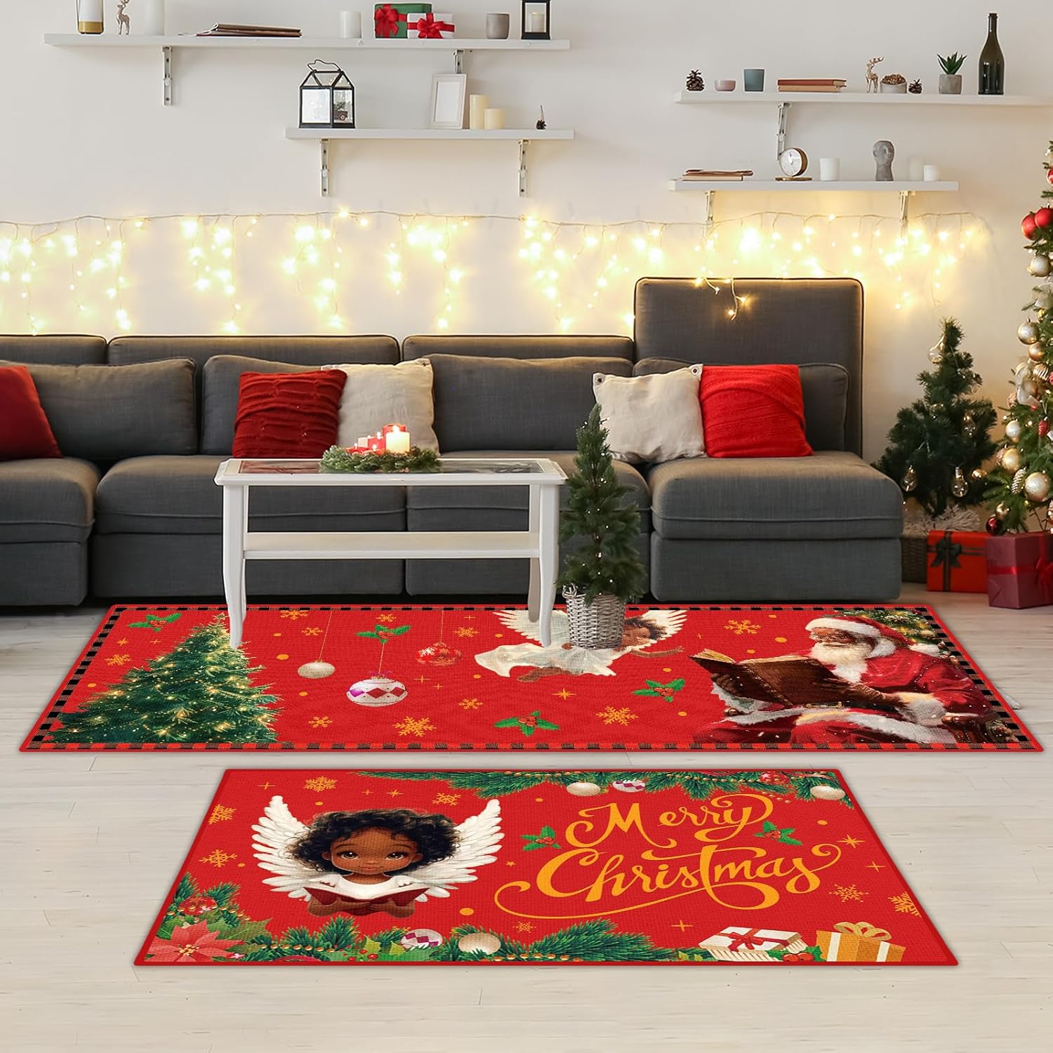 Decoración navideña para el hogar: el juego de tapetes de cocina de Navidad está diseñado con elementos clásicos de Navidad, impresos con las palabras [Feliz Navidad] y patrones de Papá Noel, árbol de Navidad, ángeles. La alfombra de cocina y los felpudos de Papá Noel afroamericano añadirán instantáneamente un fuerte ambiente festivo a tu hogar.