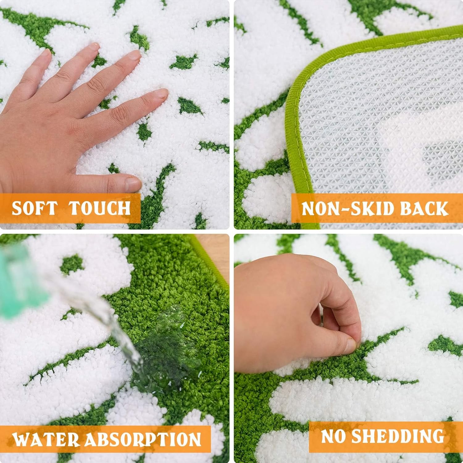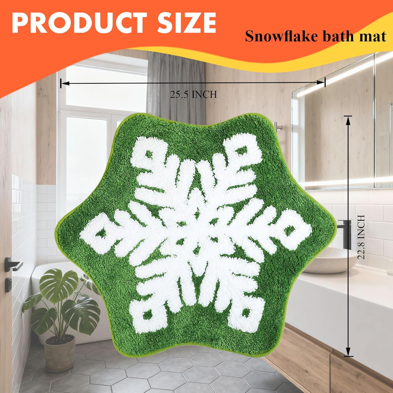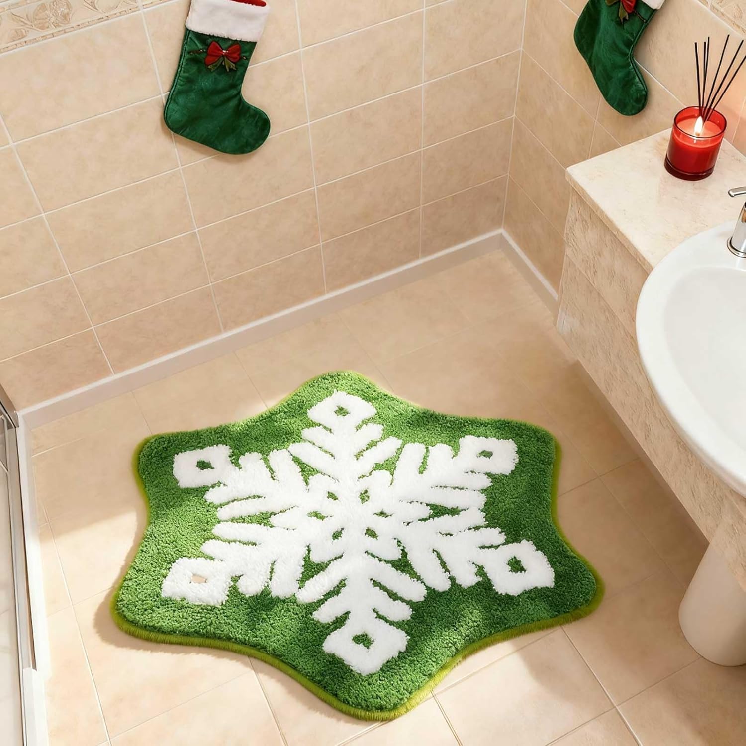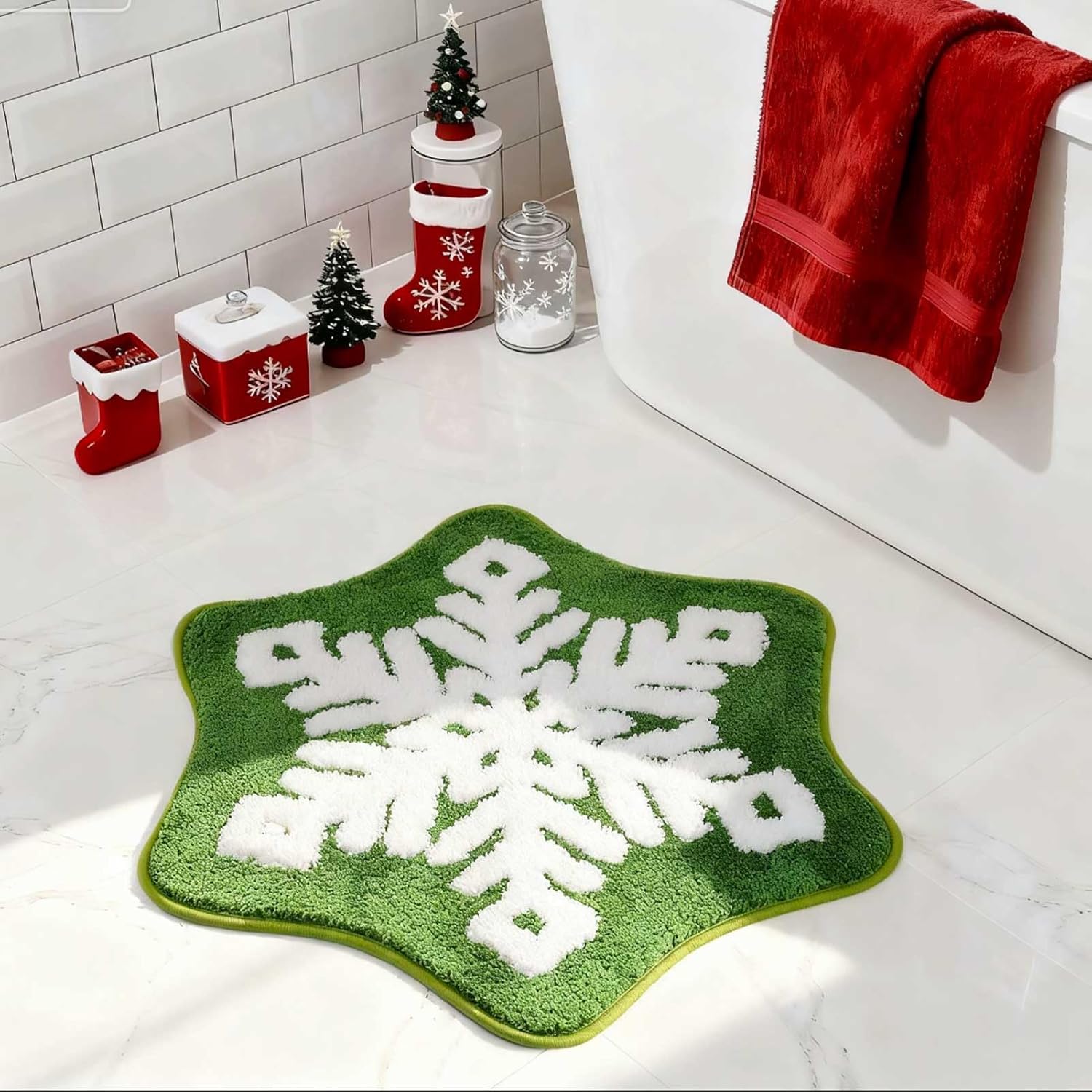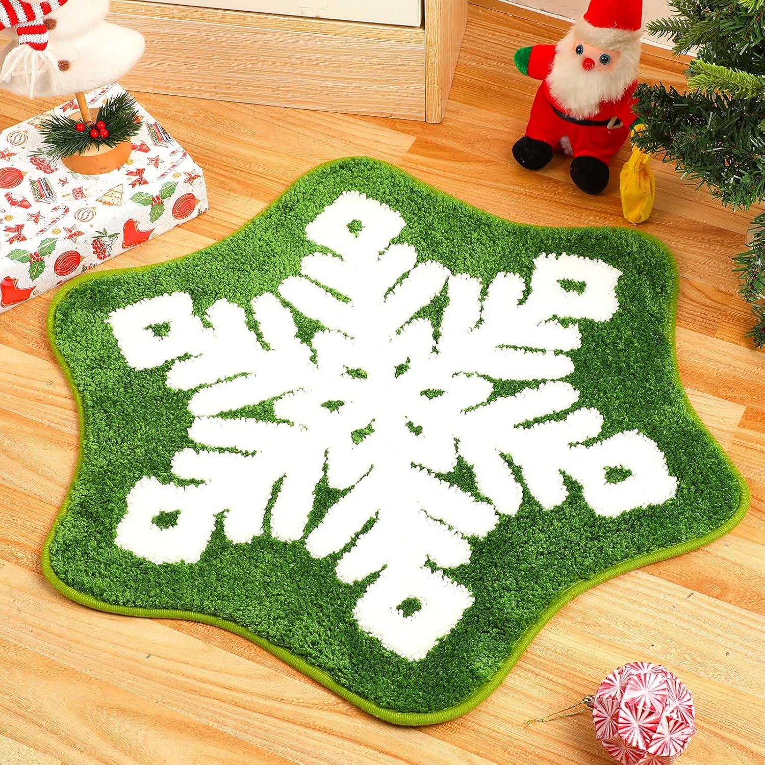 Durable & Machine Washable for Easy Cleaning: Hassle-free maintenance meets lasting durability. Our Christmas bath mat is made from high-quality, durable materials that resist fading and wear. Simply toss it in the washing machine on a gentle cycle for a quick and easy clean. This machine washable xmas rug is built to maintain its vibrant green snowflake rug colors and plush texture throughout the holiday season and for many winters to come