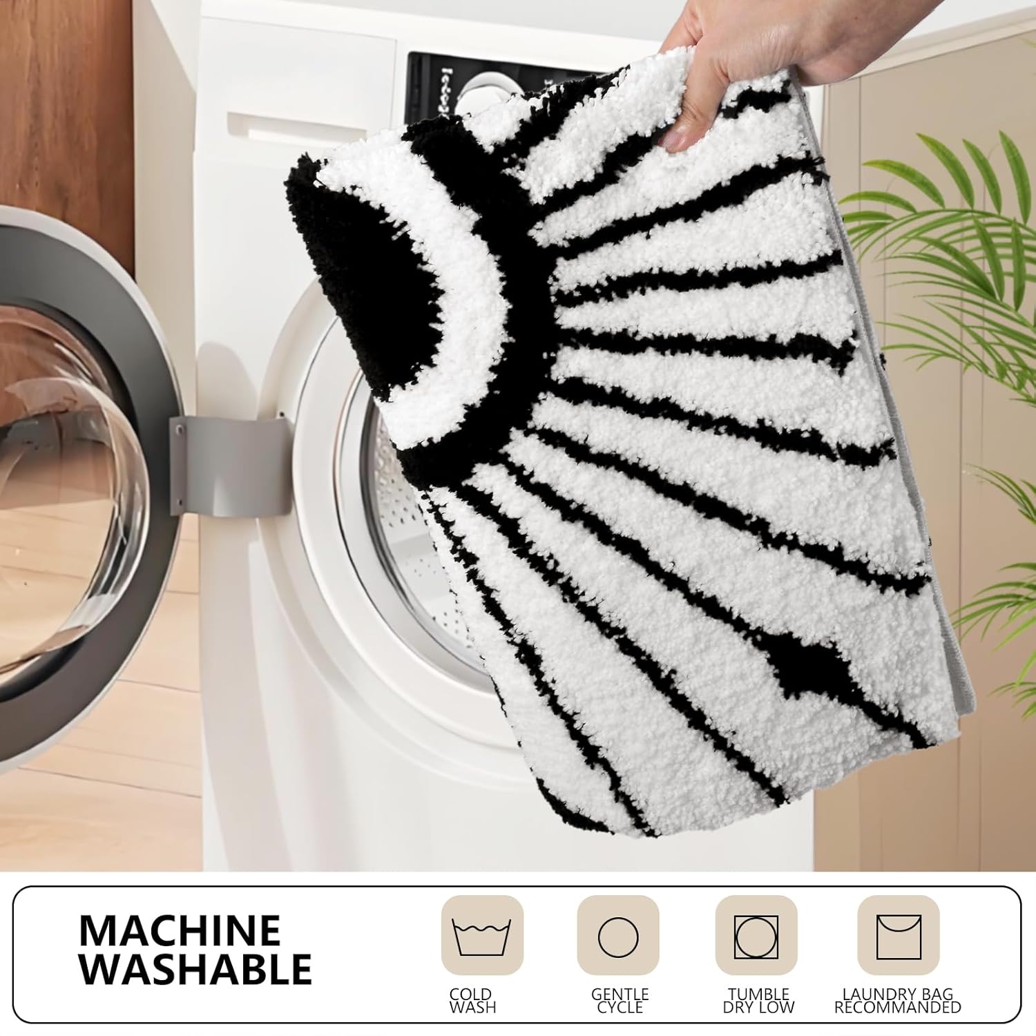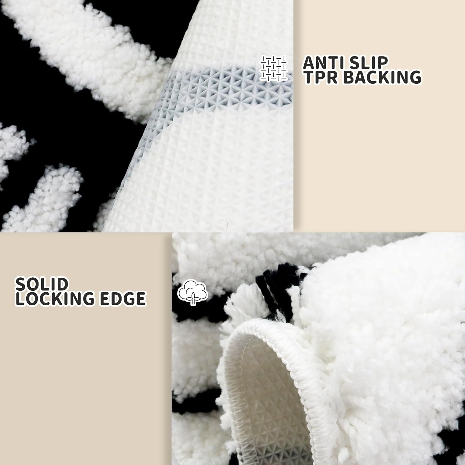 Parte trasera antideslizante: la alfombrilla de baño está diseñada con un fuerte respaldo de goma termoplástica (TPR) para evitar que se mueva y se deslice, a diferencia de otras alfombras de baño donde la parte trasera de goma puede desgastarse o caerse después de múltiples lavados. Mantén la parte inferior de los tapetes de baño antideslizantes secos y colócalos solo en suelos secos y lisos. El agua debajo puede hacer que se resbale