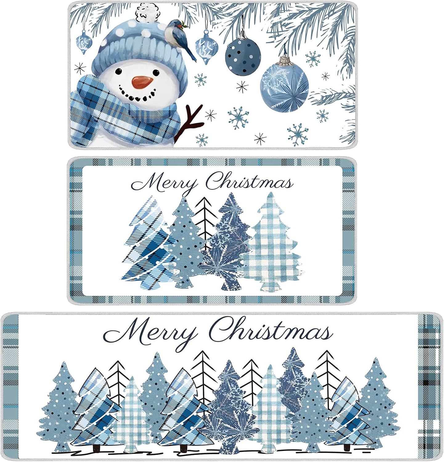 Dunzy Juego de 3 alfombras y tapetes de cocina de Navidad, muñeco de nieve, copo de nieve, de invierno, decoración de temporada, antideslizante, árbol de Navidad, búfalo, funda de cojín a cuadros