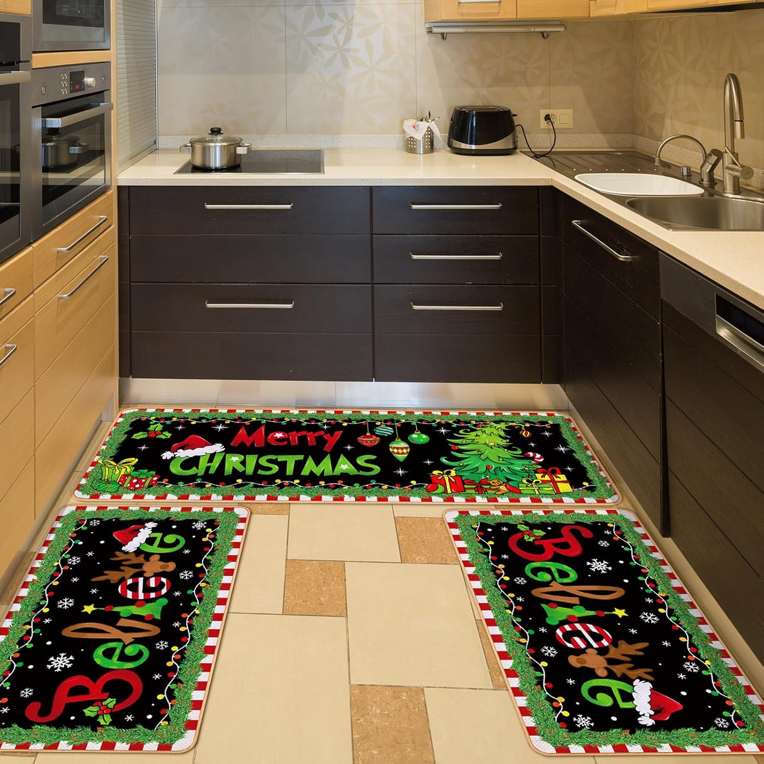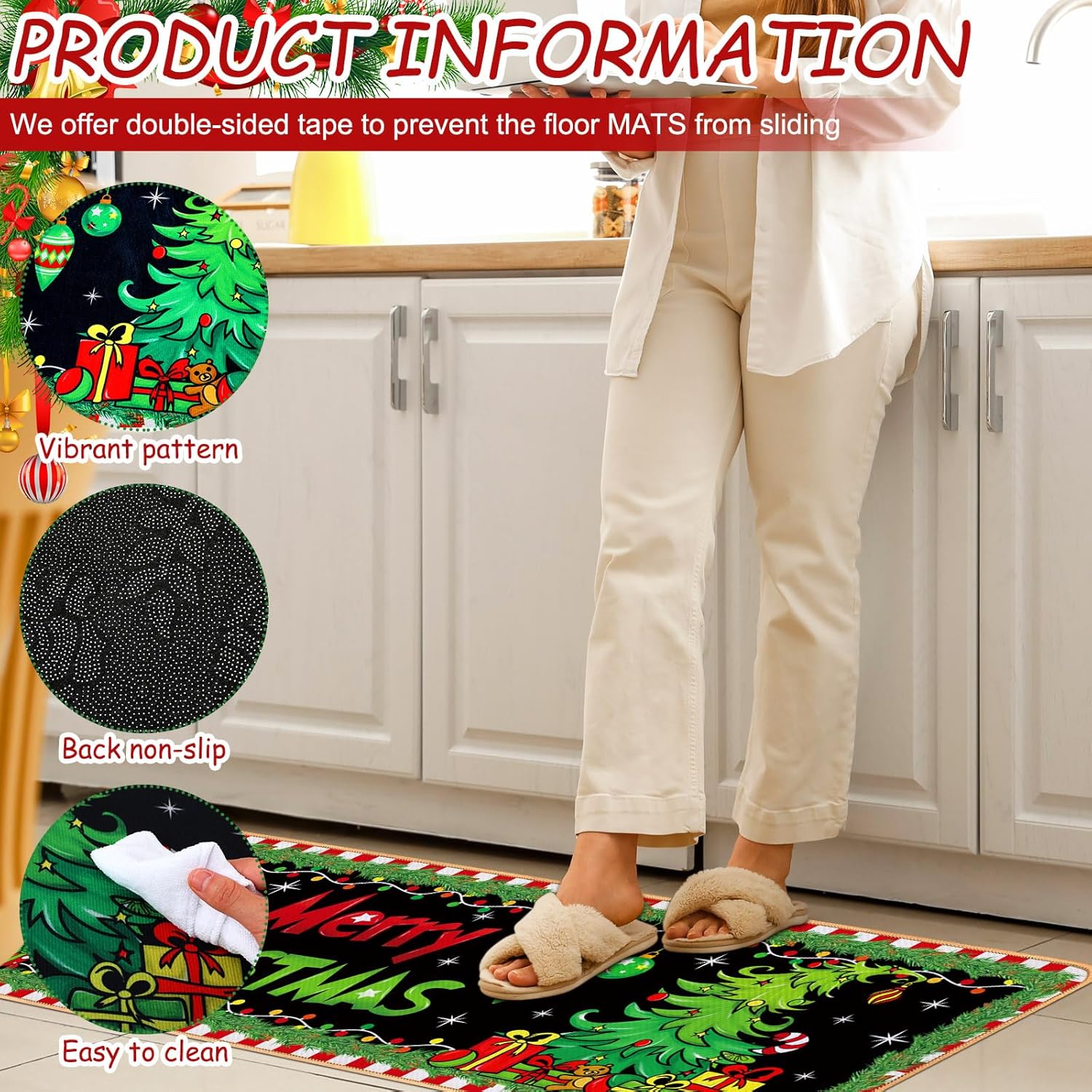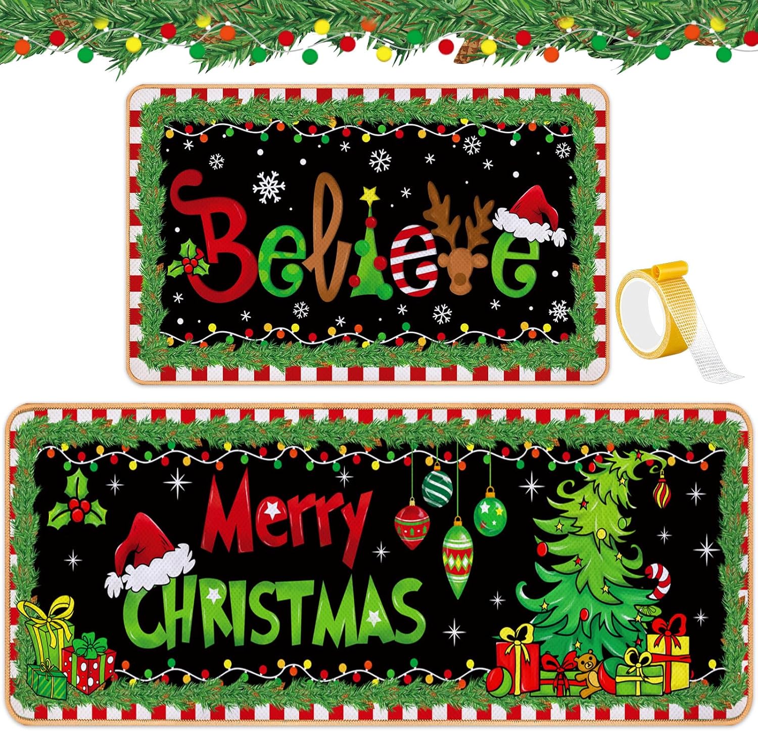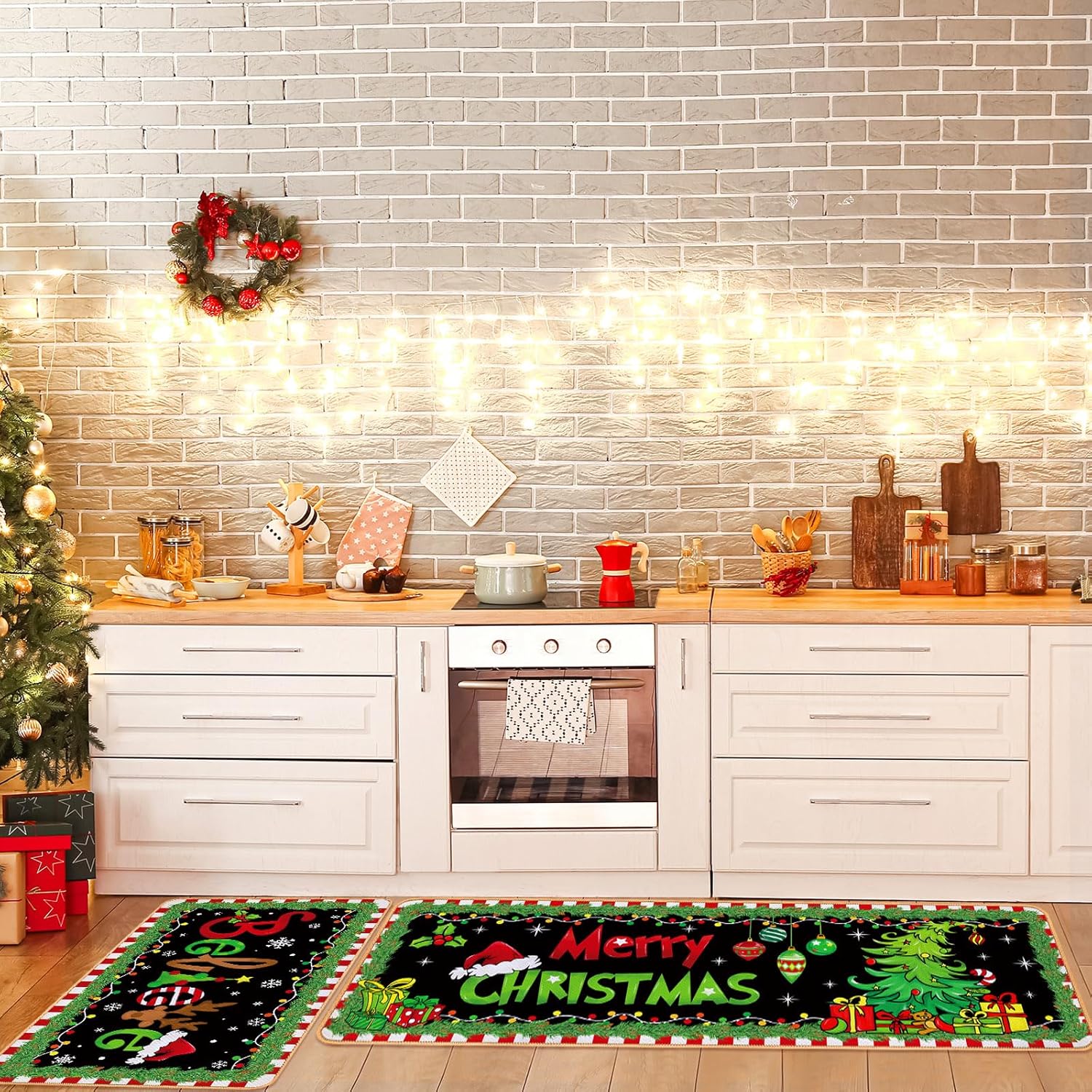 Paquete del paquete: cada paquete viene con 2 tapetes de cocina de Navidad, esto permite versatilidad en la colocación y garantiza la consistencia en la decoración festiva de tu cocina, puedes aplicarlos a la cocina, baño, terraza, baño, patio, porche, porche y entrada